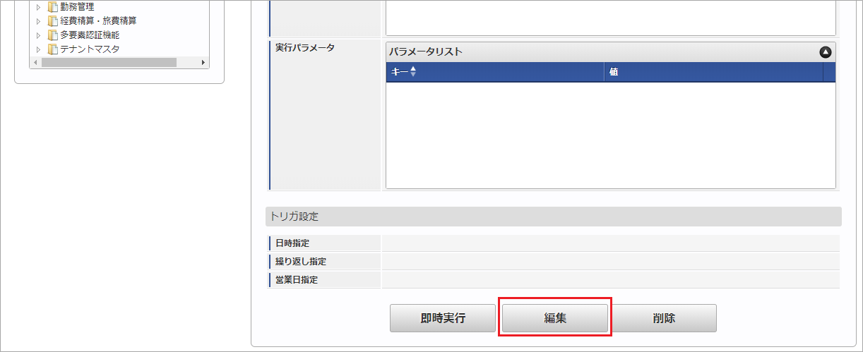「サイトマップ」→「テナント管理」→「ジョブネット設定」をクリックします。 ジョブネット一覧(画面左部)の「駅すぱあと検索条件設定」をクリックします。 「編集」をクリックします。 必要に応じて「実行パラメータ」、「トリガ設定」を編集します。コラム