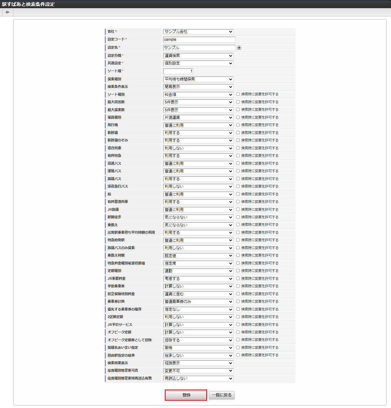 「サイトマップ」→「Kaiden!」→「マスタメンテナンス」→「駅すぱあと検索条件設定」をクリックします。 一覧画面表示後、「新規登録」をクリックします。 登録/更新画面で必要な情報を入力し、「登録」をクリックします。