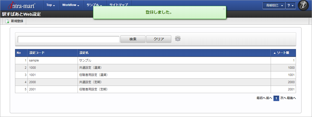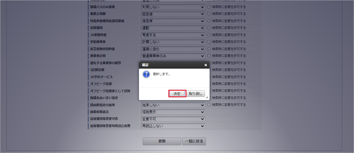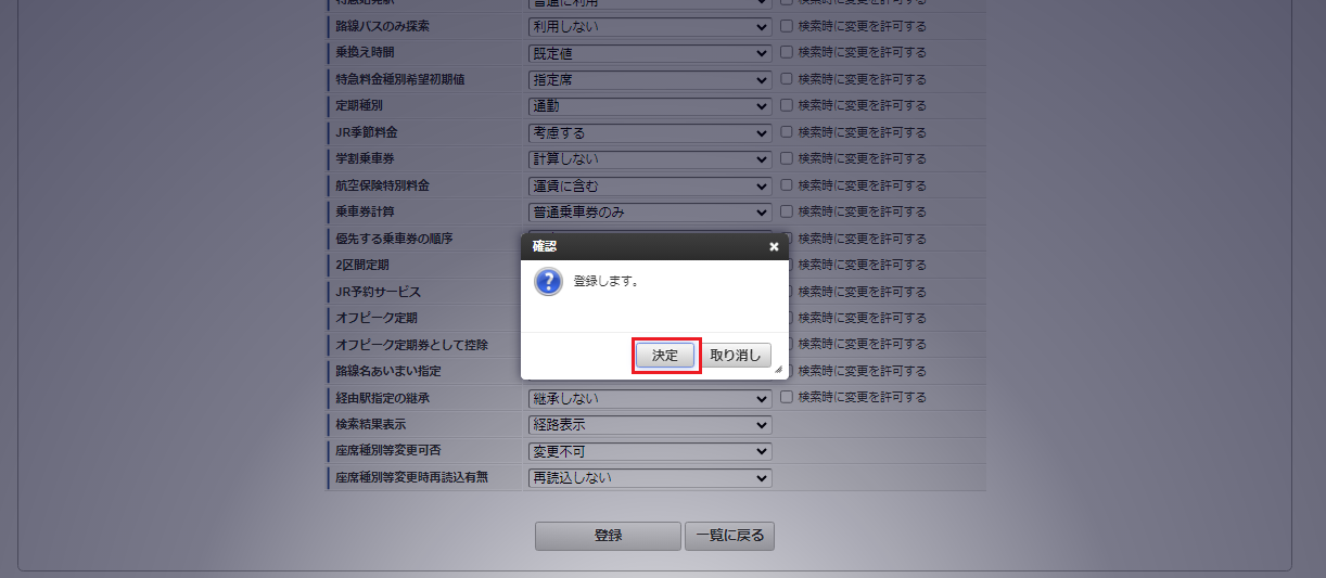 設定コード会社ごとに一意のコードを入力します。 設定名設定の名称を入力します。 設定分類「運賃検索」を選択した場合、経路探索時の設定として使用します。「定期券料金検索」を選択した場合、定期券の料金検索時の設定として使用します。 共通設定「個別設定」を選択した場合、駅すぱあと検索条件ユーザマッピングマスタでマッピングしたユーザの検索条件として使用します。「共通設定」を選択した場合、該当の会社の全てのユーザの検索条件として使用します。ただし、「個別設定」が設定されている場合、「個別設定」を優先して使用します。 ソート順ソート順を入力します。 探索種別「平均待ち時間探索」:指定した日付の平均待ち時間を考慮して経路を探索します。「出発時刻探索」:指定した日時に出発する経路を探索します。「到着時刻探索」:指定した日時に到着する経路を探索します。「始発電車探索」:指定した日付の始発経路を探索します。「最終電車探索」:指定した日付の最終経路を探索します。「ダイヤ探索」:「出発時刻探索」、「到着時刻探索」、「始発電車探索」、「最終電車探索」から選択して経路を探索します。設定分類が「定期券料金検索」の場合、「平均待ち時間探索」を設定してください。 検索条件表示「簡易表示」を設定した場合、経路探索時に詳細な検索条件の設定画面を非表示にします。「詳細表示」を設定した場合、経路探索時に詳細な検索条件の設定画面が表示されます。 詳細検索条件全般「検索時に変更を許可する」にチェックを入れた項目は、詳細な検索条件の設定画面に表示され、ユーザが検索条件を変更できます。また、選択した項目が詳細な検索条件の設定画面表示時の初期値となります。「検索時に変更を許可する」にチェックを入れた項目がある場合、「検索条件表示」に「詳細表示」を選択してください。 確認ポップアップが表示されますので、「決定」をクリックします。 新規登録することができました。コラム