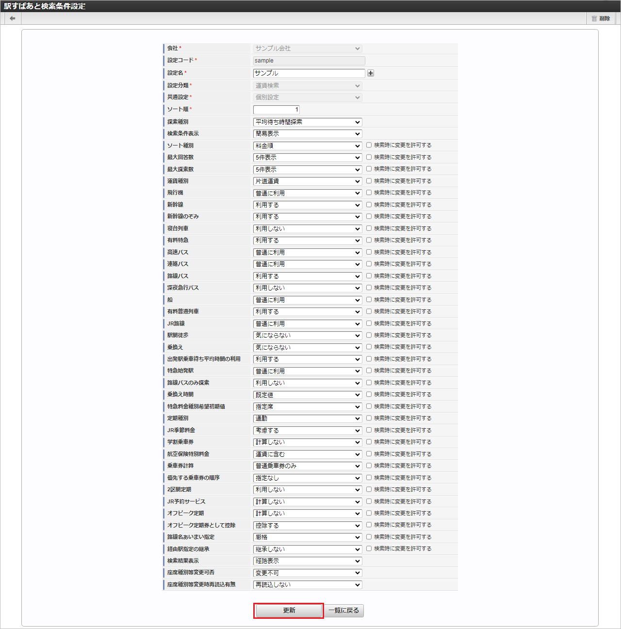 検索欄に検索したい駅すぱあと検索条件設定の以下の項目を入力して「検索」をクリックすると、結果を一覧に表示します。