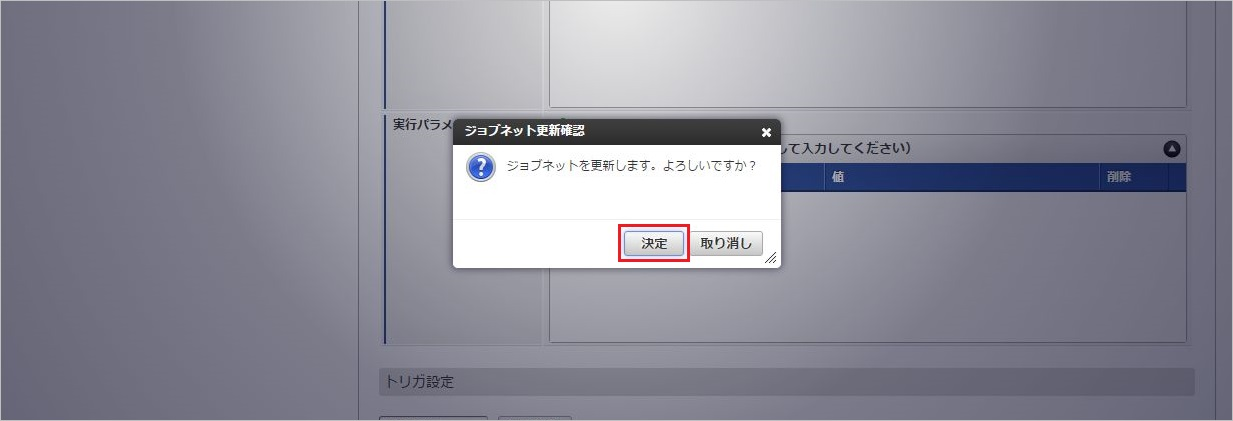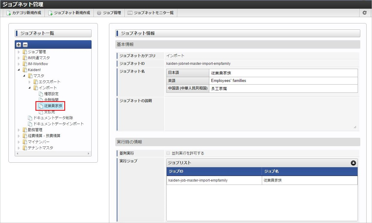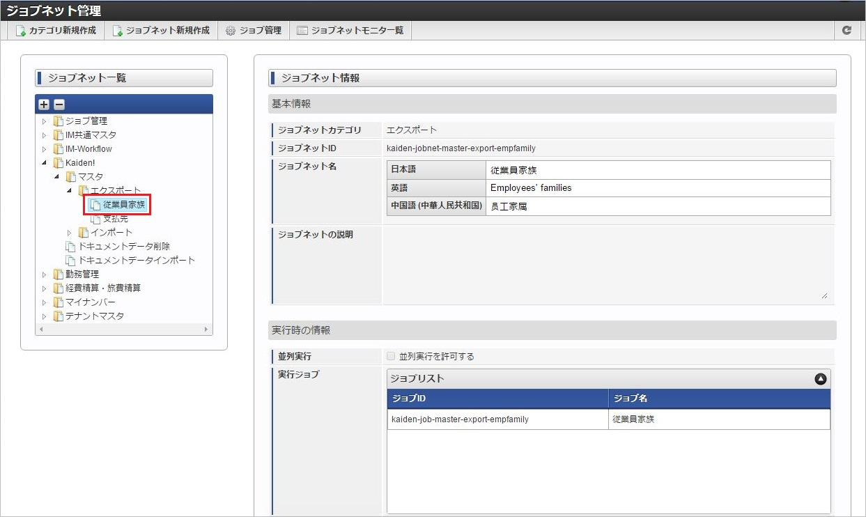 ジョブID ジョブ名(ジョブ選択時のツリー) kaiden-job-master-export-empfamily Kaiden! / マスタ / エクスポート / 従業員家族 編集後、「更新」をクリックします。 確認ポップアップの「決定」をクリックします。 ジョブネットが設定されました。コラム