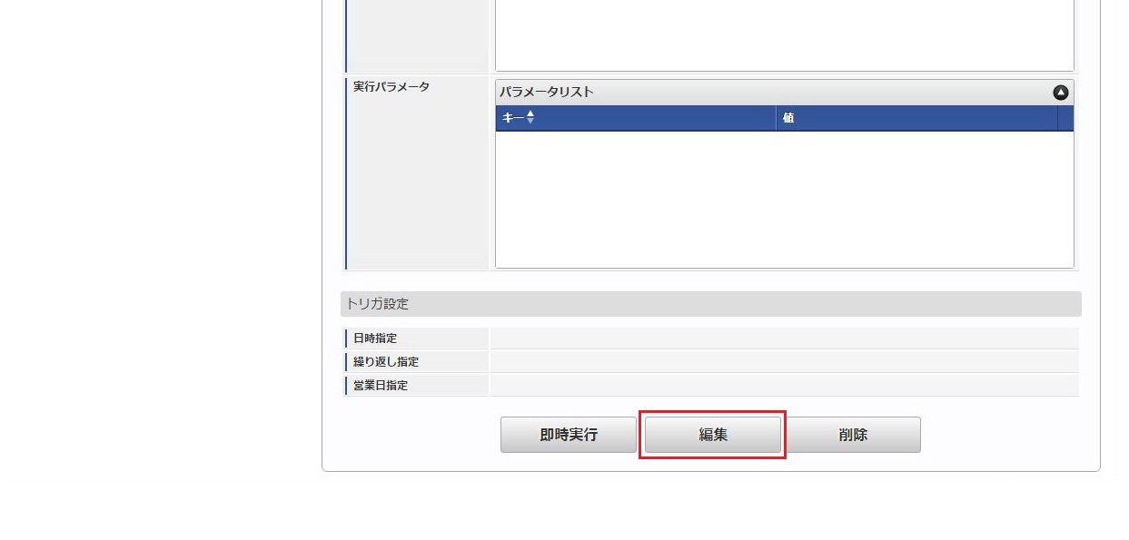 「サイトマップ」→「テナント管理」→「ジョブネット設定」をクリックします。 ジョブネット一覧(画面左部)の「従業員家族エクスポート」をクリックします。 「編集」をクリックします。 必要に応じて「実行パラメータ」、「トリガ設定」を編集します。コラム