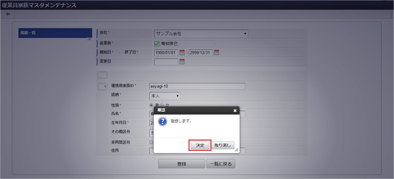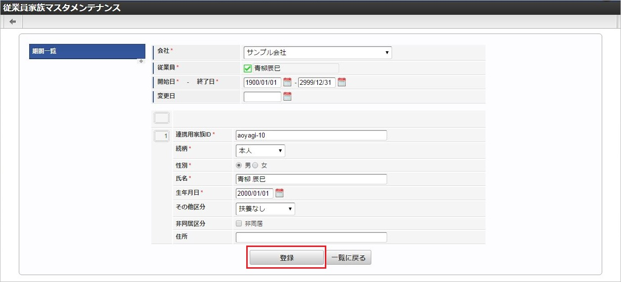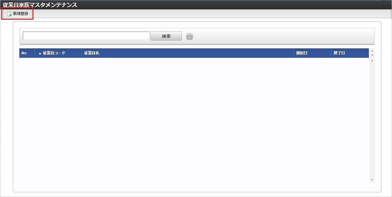 「サイトマップ」→「Kaiden!」→「マスタメンテナンス」→「従業員家族」をクリックします。 一覧画面表示後、「新規登録」をクリックします。 登録/更新画面で必要な情報を入力し、「登録」をクリックします。
