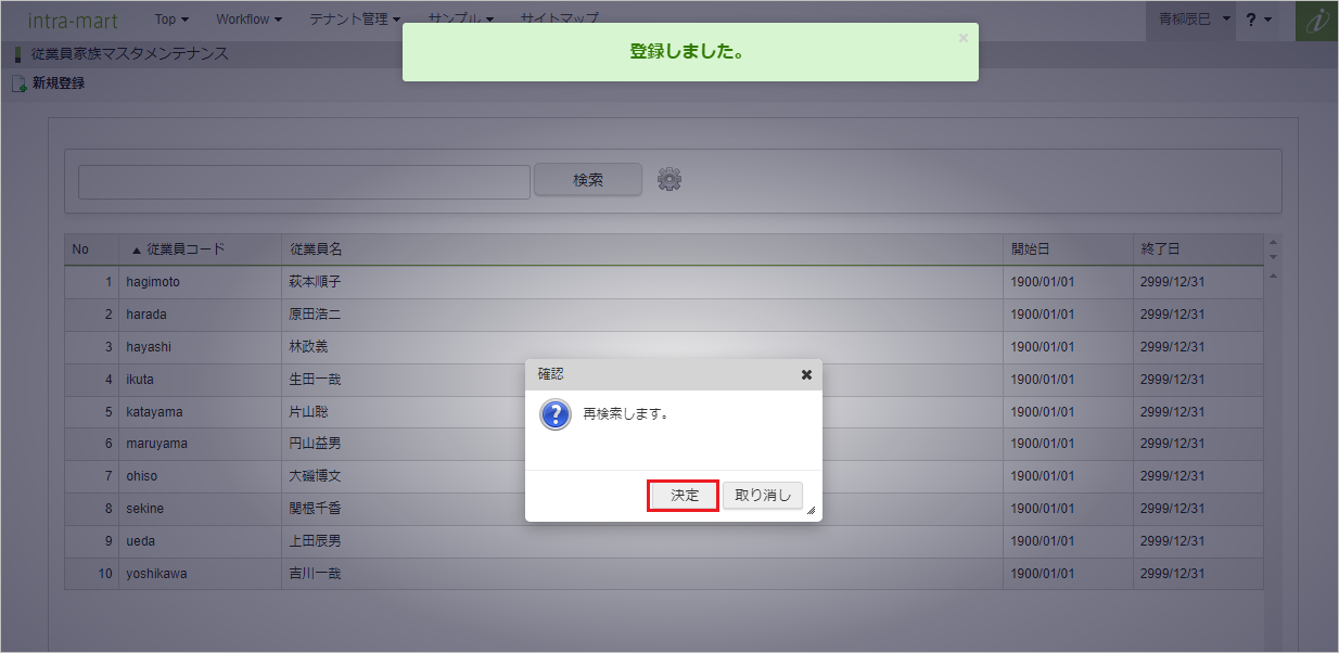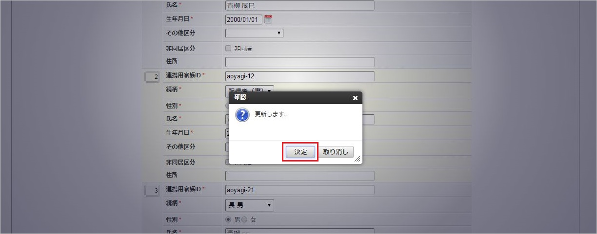 確認ポップアップが表示されますので、「決定」をクリックします。 更新することができました。「決定」をクリックすると、一覧画面表示時に再検索します。