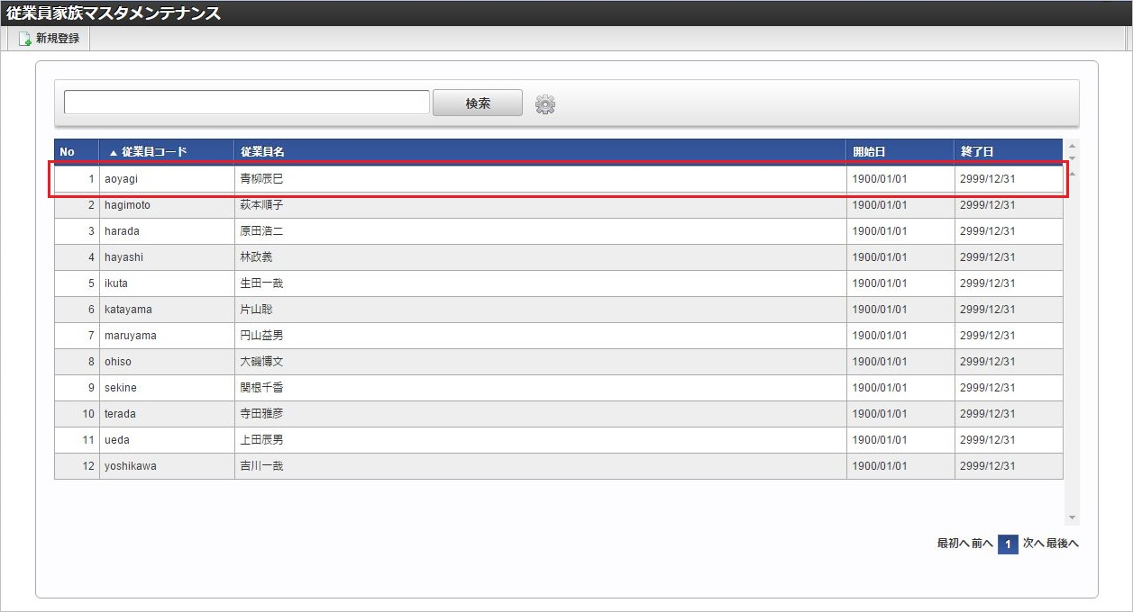 従業員コード 従業員名 一覧画面の対象データが表示されている行をクリックします。コラム
