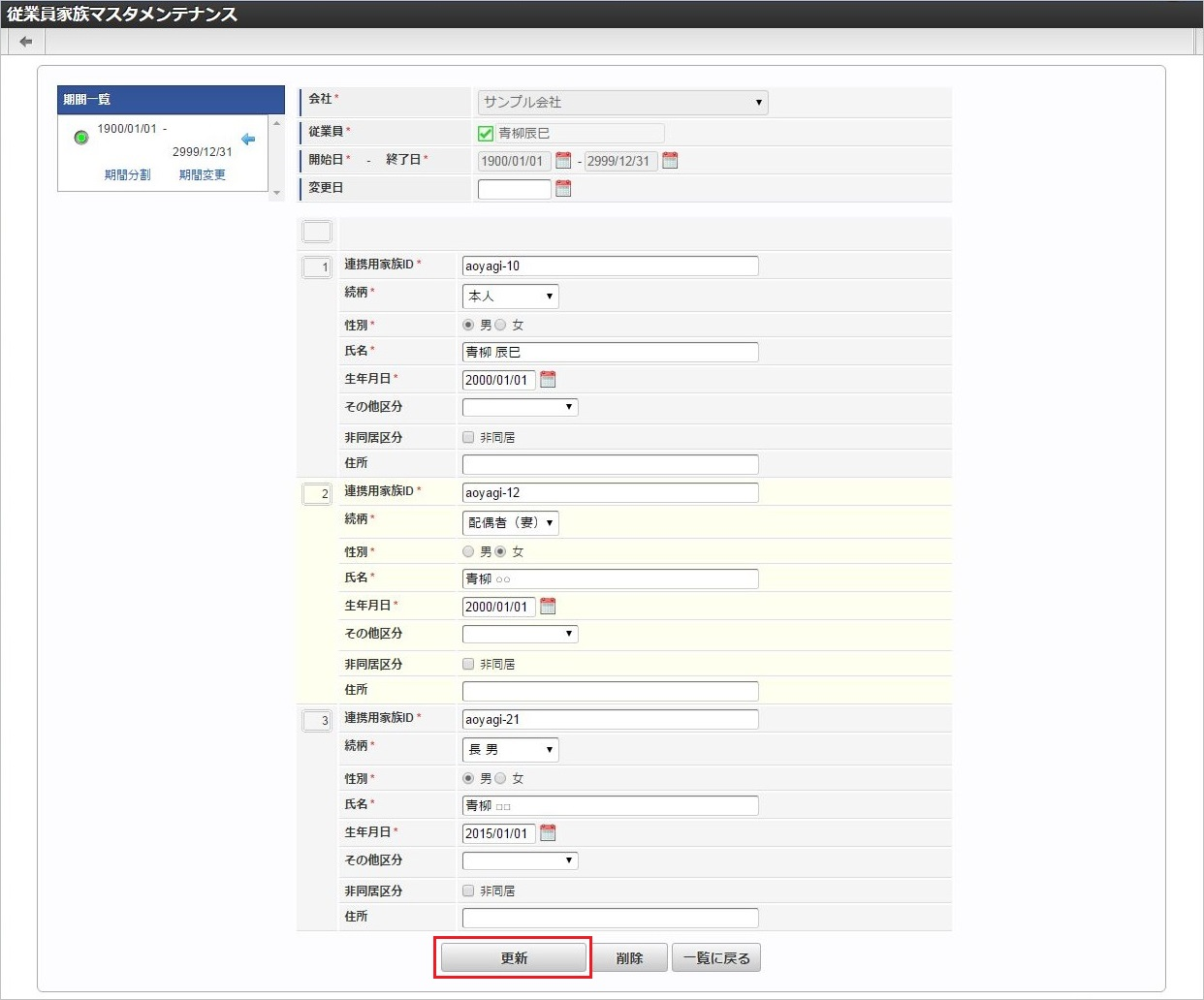 No(列) 項目名 必須 最大文字数 備考 1 会社コード ○ 100 2 ユーザコード ○ 100 3 開始日 10 yyyy/MM/dd形式未来互換用の項目ですので、設定された場合でも使用しません。4 終了日 10 yyyy/MM/dd形式未来互換用の項目ですので、設定された場合でも使用しません。5 変更日 10 yyyy/MM/dd形式 6 削除フラグ ○ 1 0:有効1:無効(論理削除)7 連番 ○ 18 8 連携用家族ID ○ 100 9 続柄 ○ 100 10 性別 ○ 1 1:男2:女11 氏名 ○ 250 12 生年月日 ○ 10 13 その他区分 100 14 非同居区分 1 0:同居1:非同居15 住所 250 データサンプル"comp_sample_01","aoyagi","","","","0","1","aoyagi-10","100004-10","1","青柳辰巳","2000/01/01","","",""コラム