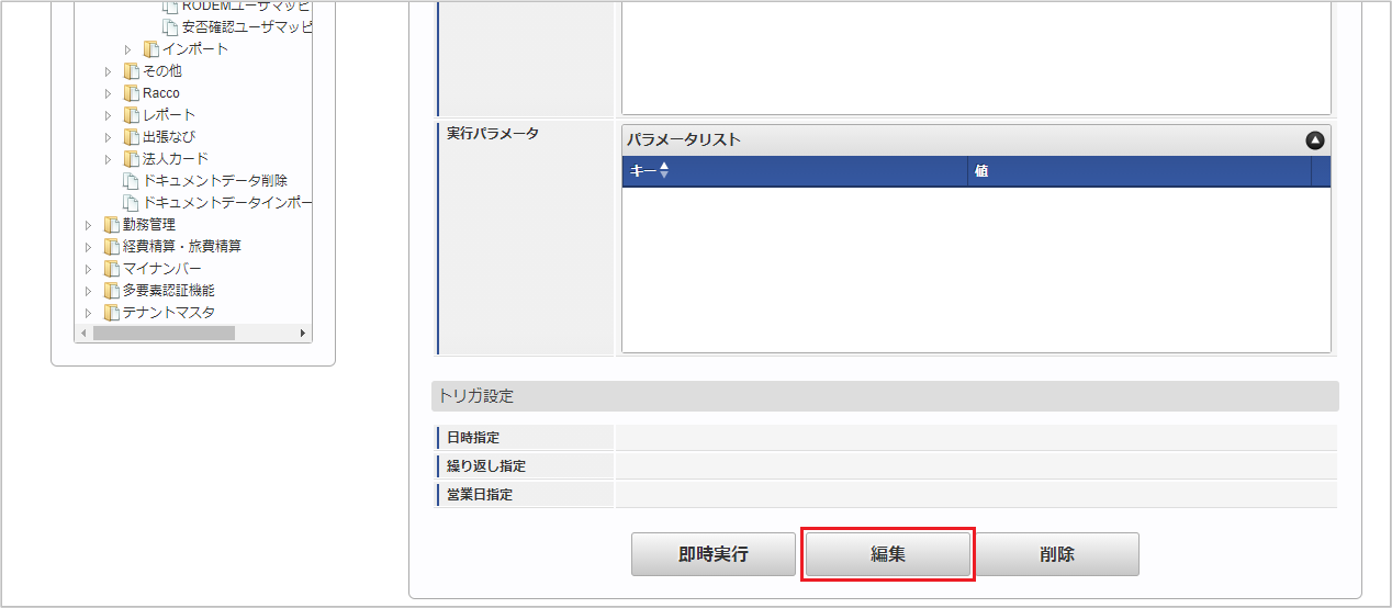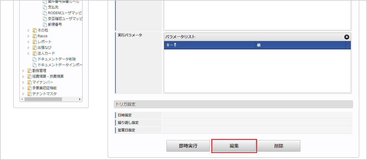 「サイトマップ」→「テナント管理」→「ジョブネット設定」をクリックします。 ジョブネット一覧(画面左部)の「ファイルパス管理」をクリックします。 「編集」をクリックします。 必要に応じて「実行パラメータ」、「トリガ設定」を編集します。コラム