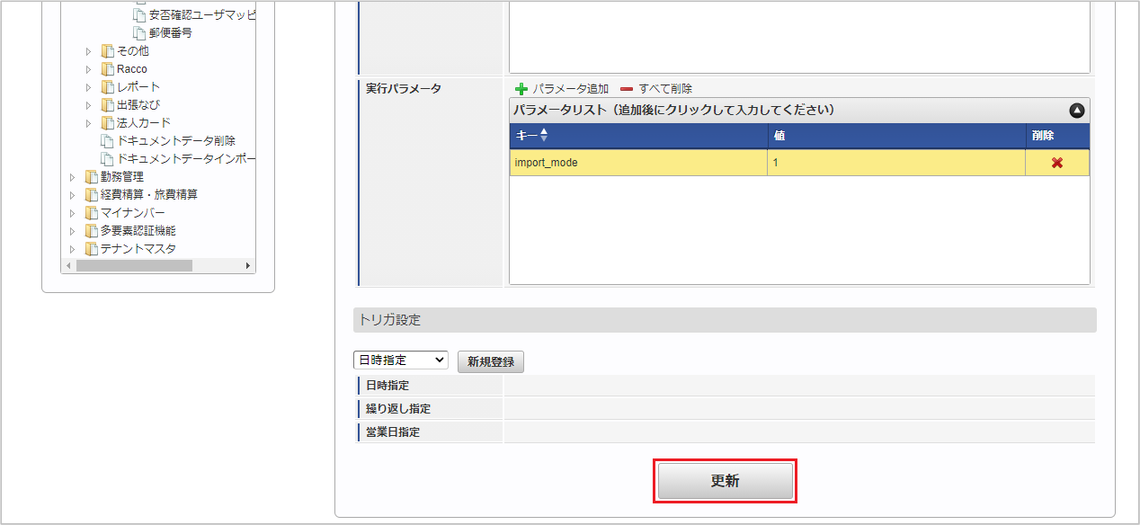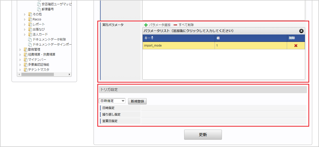 設定が必要な実行パラメータの詳細は、実行パラメータを参照してください。トリガ設定の設定方法は『テナント管理者操作ガイド』を参照してください。コラム