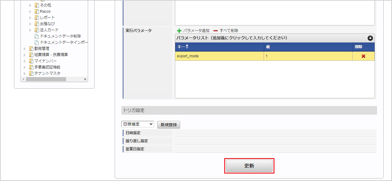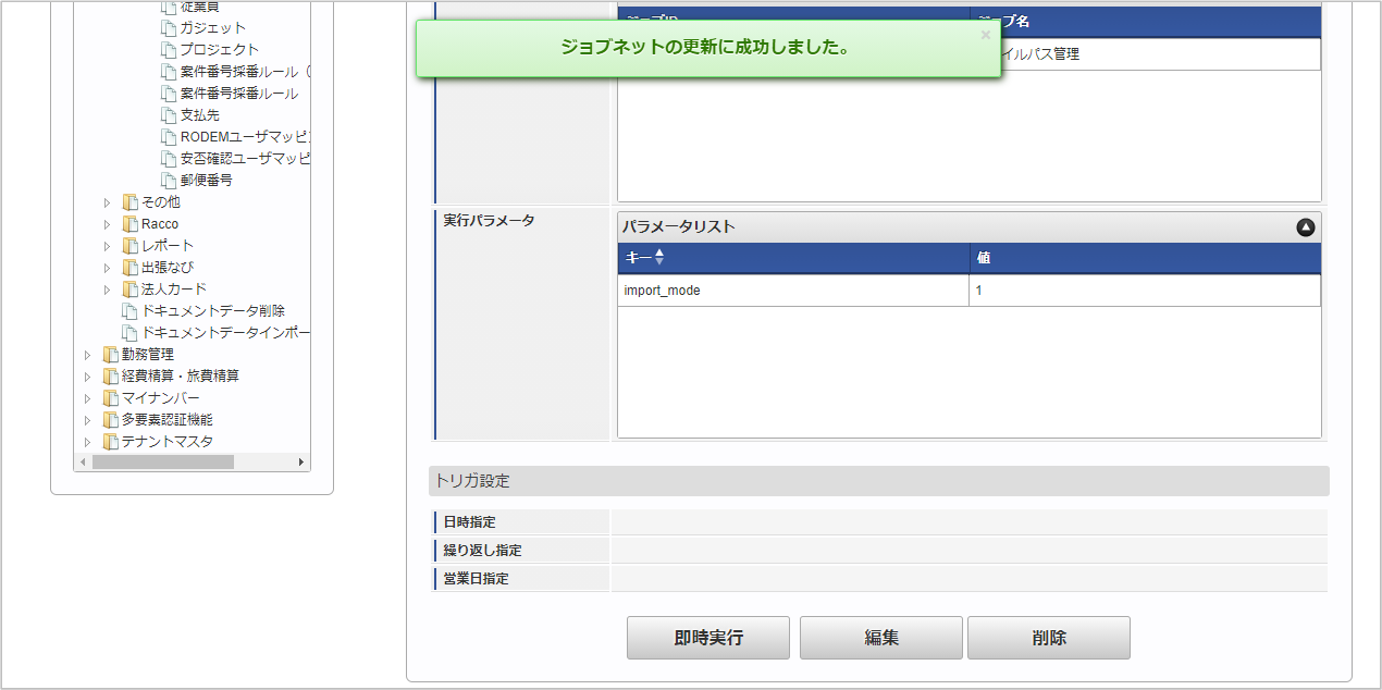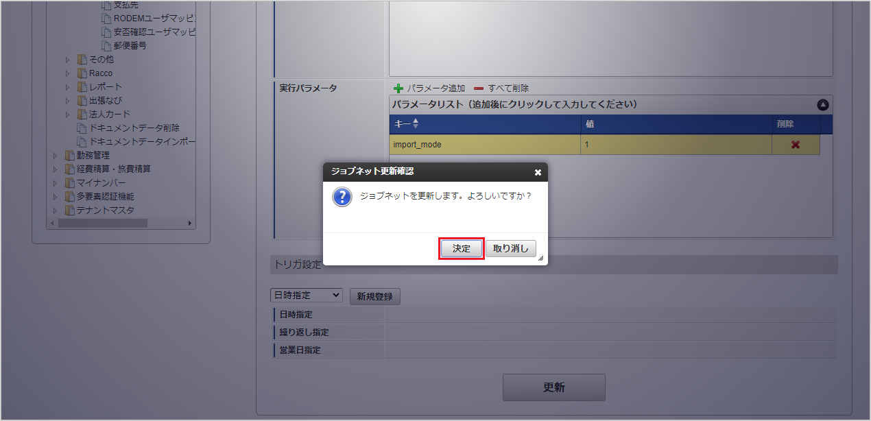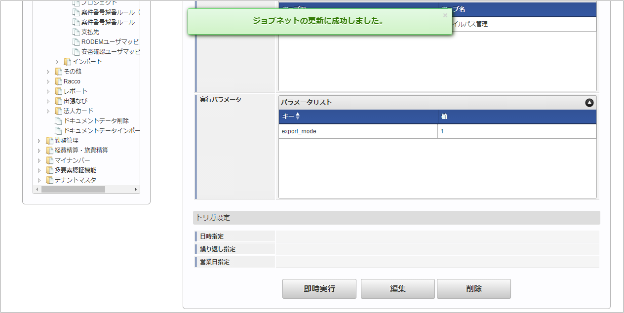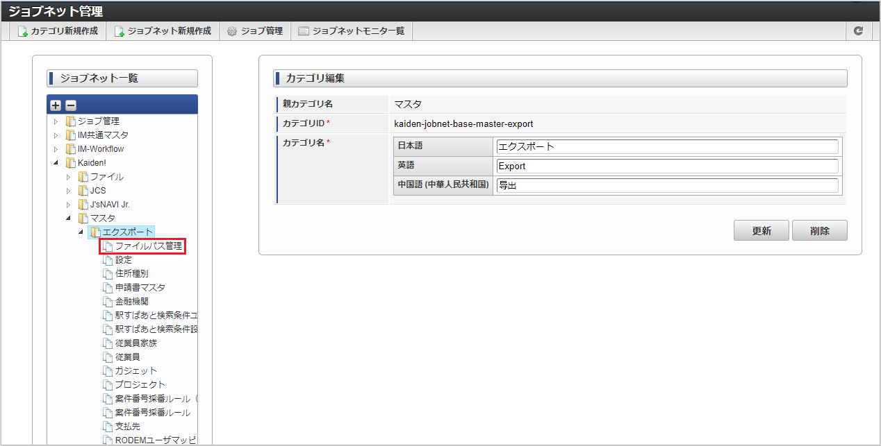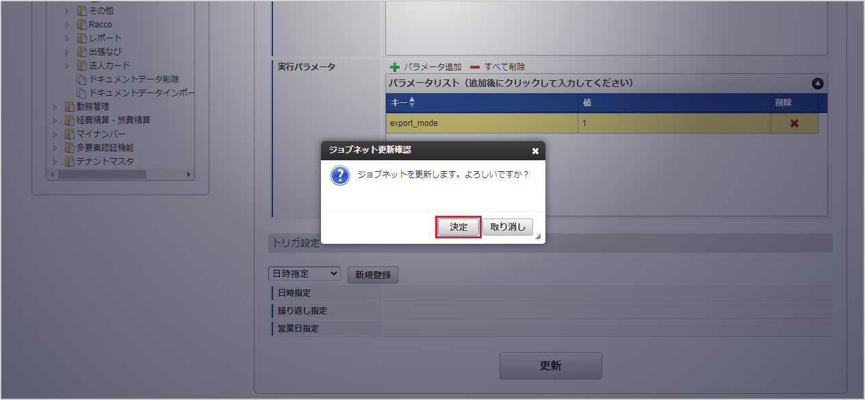 ジョブID ジョブ名(ジョブ選択時のツリー) kaiden-job-base-master-export-file-path-management Kaiden! / マスタ / エクスポート / ファイルパス管理 編集後、「更新」をクリックします。 確認ポップアップの「決定」をクリックします。 ジョブネットが設定されました。