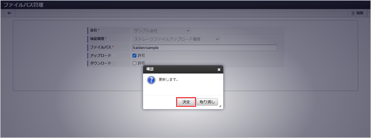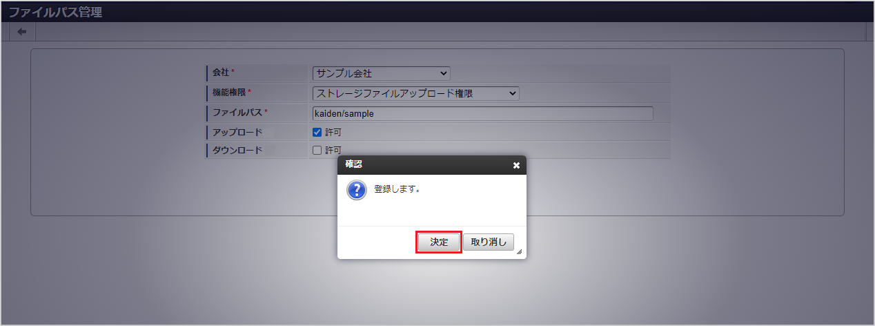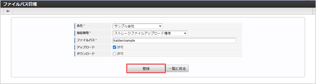 「会社」、「機能権限」が同一であり、先頭、最後尾の「/」以外が同一の「ファイルパス」が既に登録されている場合、登録時にエラーが発生します。「会社」、「機能権限」のいずれかが異なる場合、エラーは発生しません。