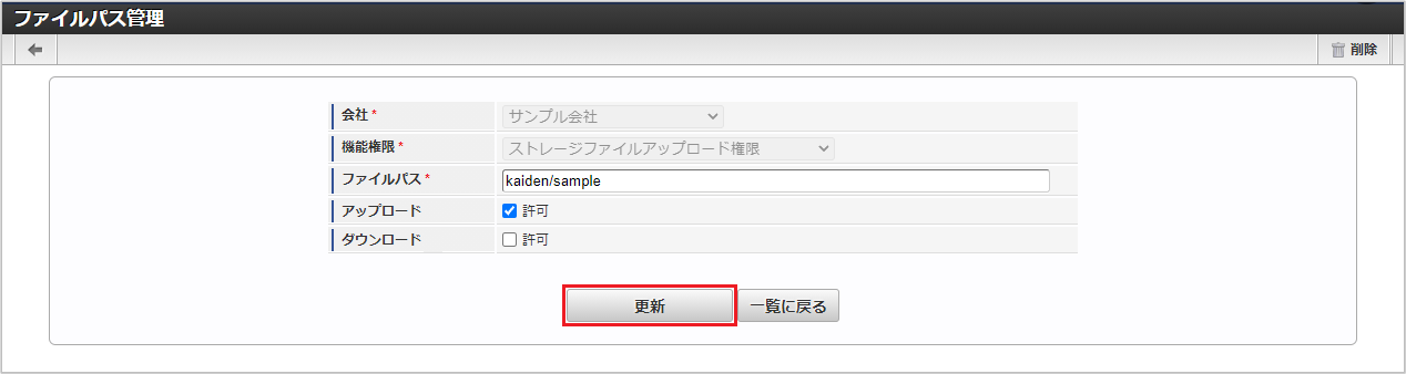 機能権限機能権限を選択します。 ファイルパス会社、機能権限ごとに一意のファイルパスを入力します。 アップロードストレージアップロード/ダウンロード機能でアップロードを許可する場合、チェックします。 ダウンロードストレージアップロード/ダウンロード機能でダウンロードを許可する場合、チェックします。コラム