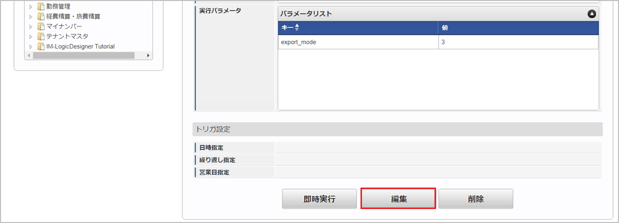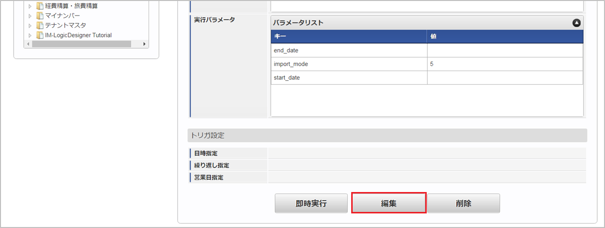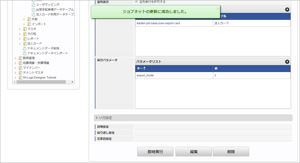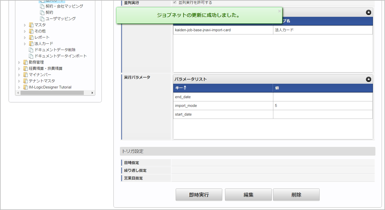 「サイトマップ」→「テナント管理」→「ジョブネット設定」をクリックします。 ジョブネット一覧(画面左部)の「法人カード」をクリックします。 「編集」をクリックします。 必要に応じて「実行パラメータ」、「トリガ設定」を編集します。コラム