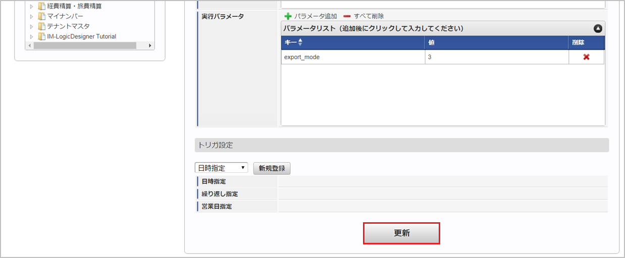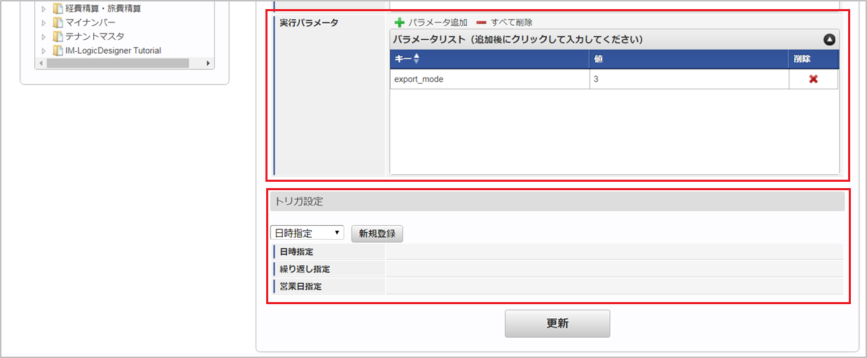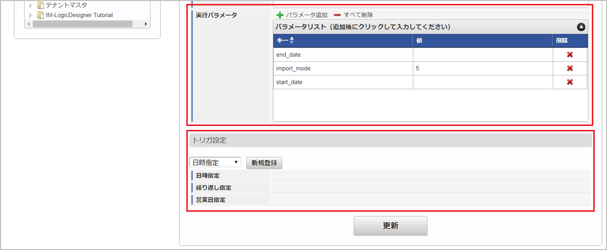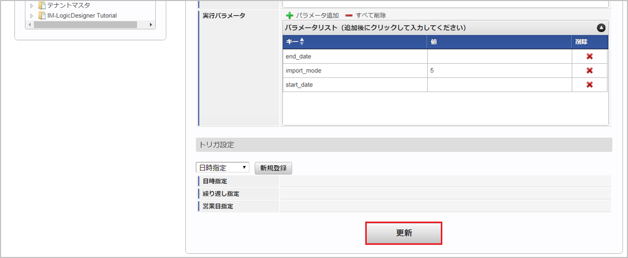 設定が必要な実行パラメータの詳細は、実行パラメータを参照してください。トリガ設定の設定方法は『テナント管理者操作ガイド』を参照してください。コラム