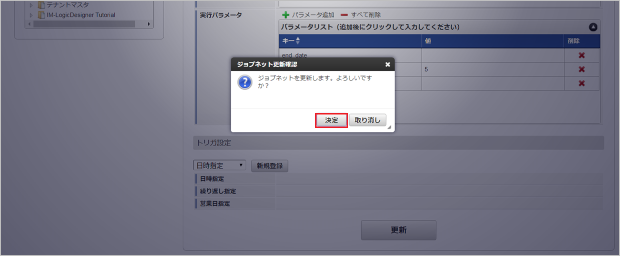 ジョブID ジョブ名(ジョブ選択時のツリー) kaiden-job-base-jnavi-import-card Kaiden! / J’sNAVI Jr. / インポート / 法人カード 編集後、「更新」をクリックします。 確認ポップアップの「決定」をクリックします。 ジョブネットが設定されました。コラム