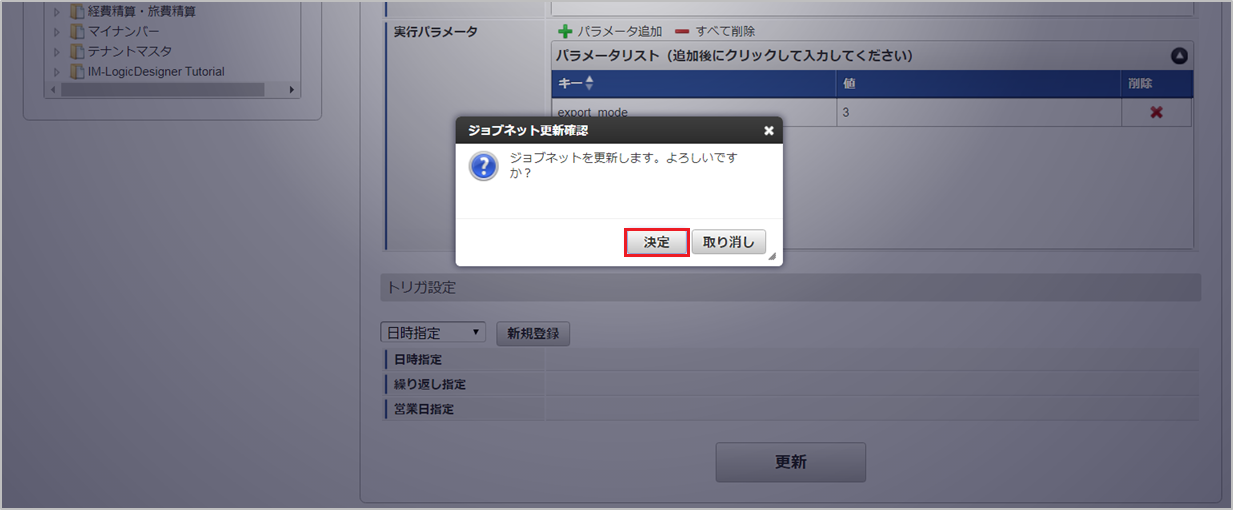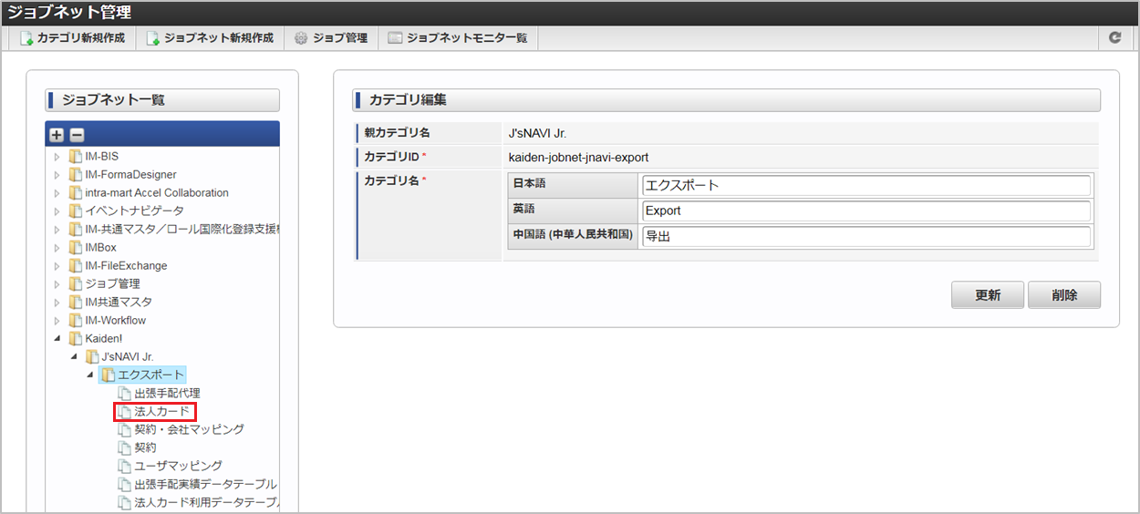 ジョブID ジョブ名(ジョブ選択時のツリー) kaiden-job-base-jnavi-export-card Kaiden! / J’sNAVI Jr. / エクスポート / 法人カード 編集後、「更新」をクリックします。 確認ポップアップの「決定」をクリックします。 ジョブネットが設定されました。