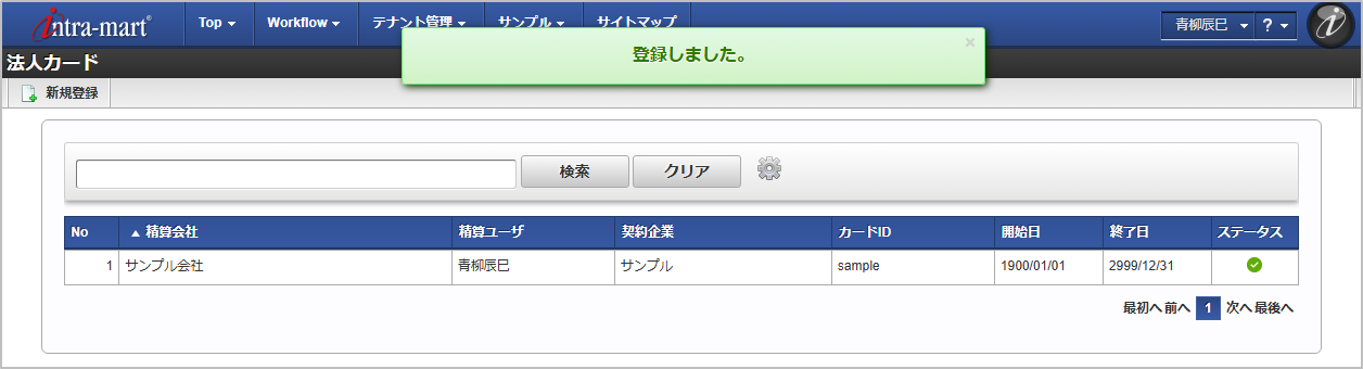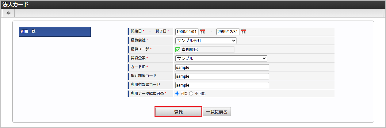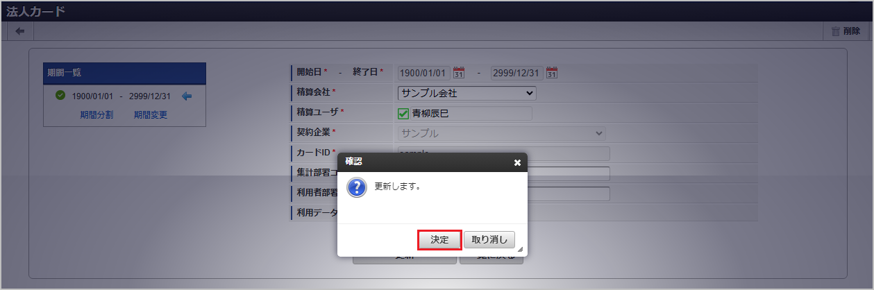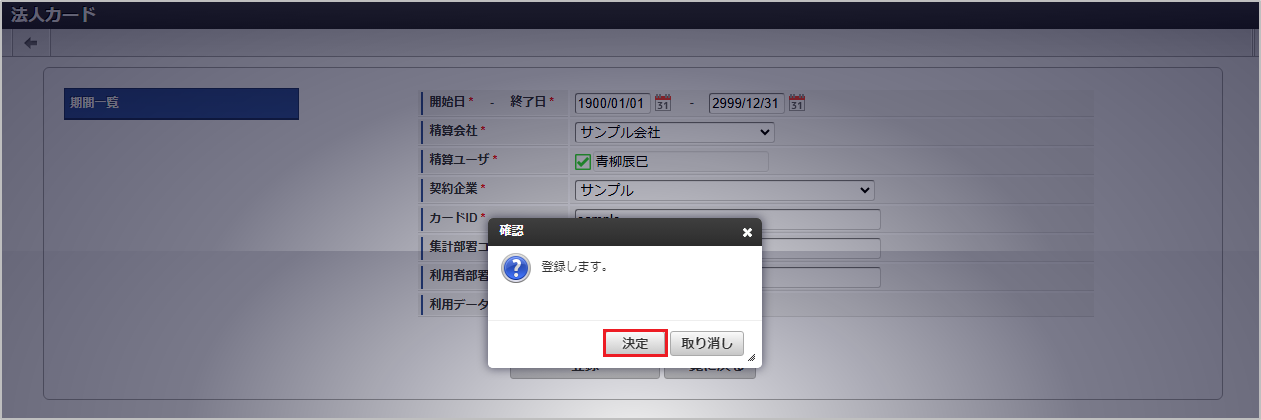 悪用の恐れがあるため、「カードID」に、法人カードのカード番号を入力しないでください。「カードID」には、法人カードを特定するためのシステム内で一意の任意のIDを入力してください。 確認ポップアップが表示されますので、「決定」をクリックします。 新規登録することができました。