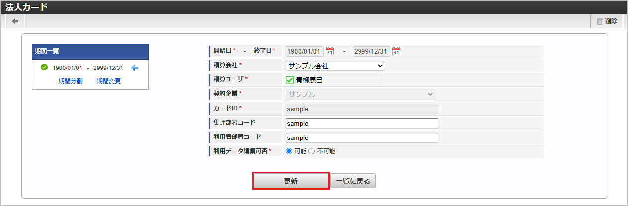 項目 項目名 備考 corporateCd 契約企業コード cardId カードID startDate 開始日 yyyy/MM/dd形式 endDate 終了日 yyyy/MM/dd形式 deleteFlag 削除フラグ aggregateDeptCd 集計部署コード memberDeptCd 利用者部署コード settleCompanyCd 精算会社コード settleUserCd 精算ユーザコード editFlg 利用データ編集可否 0:無効1:有効