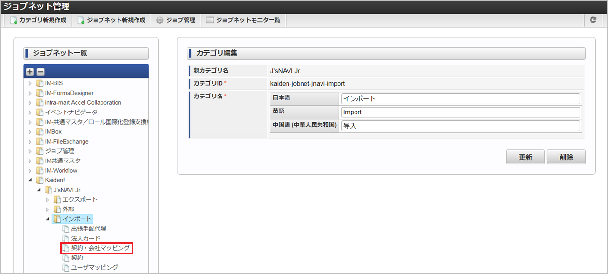 ジョブID ジョブ名(ジョブ選択時のツリー) kaiden-job-base-jnavi-import-company Kaiden! / J’sNAVI Jr. / インポート / 契約・会社マッピング 編集後、「更新」をクリックします。 確認ポップアップの「決定」をクリックします。 ジョブネットが設定されました。コラム