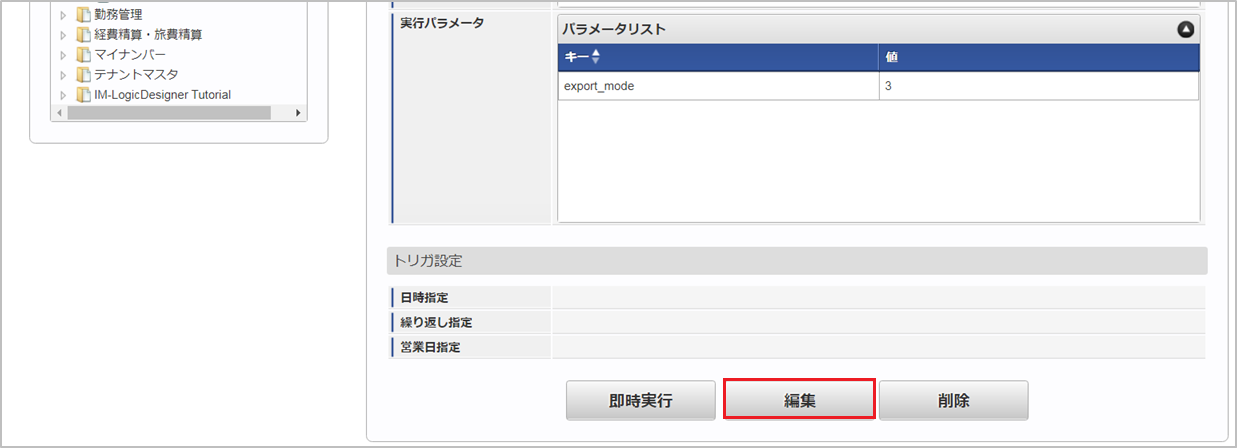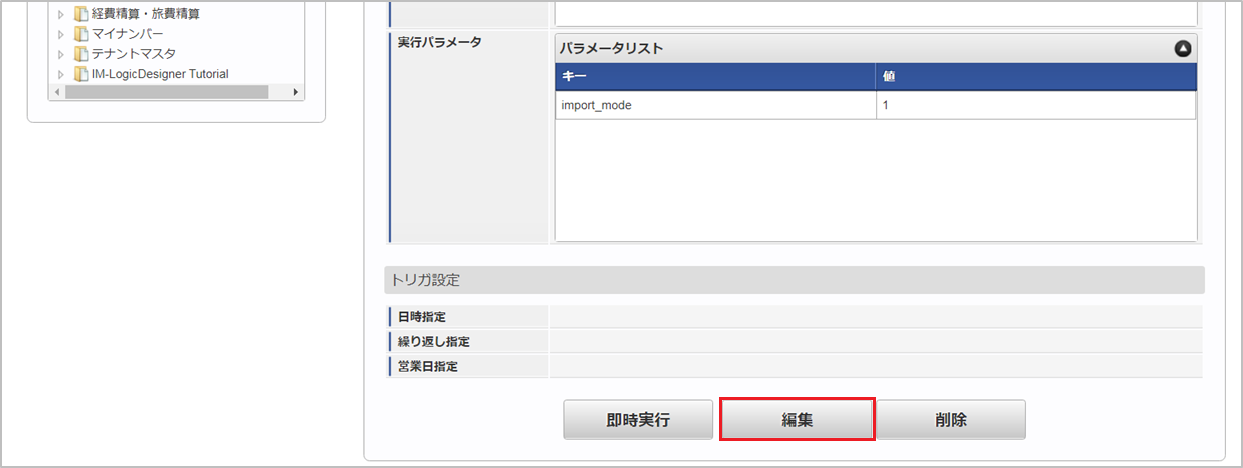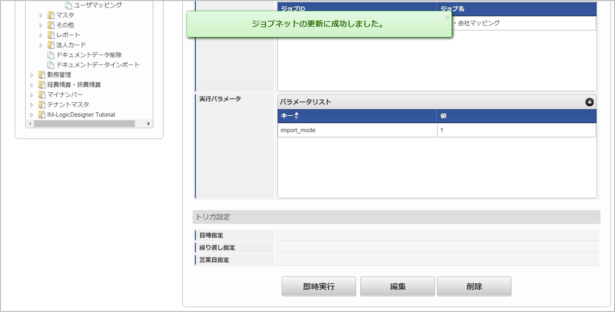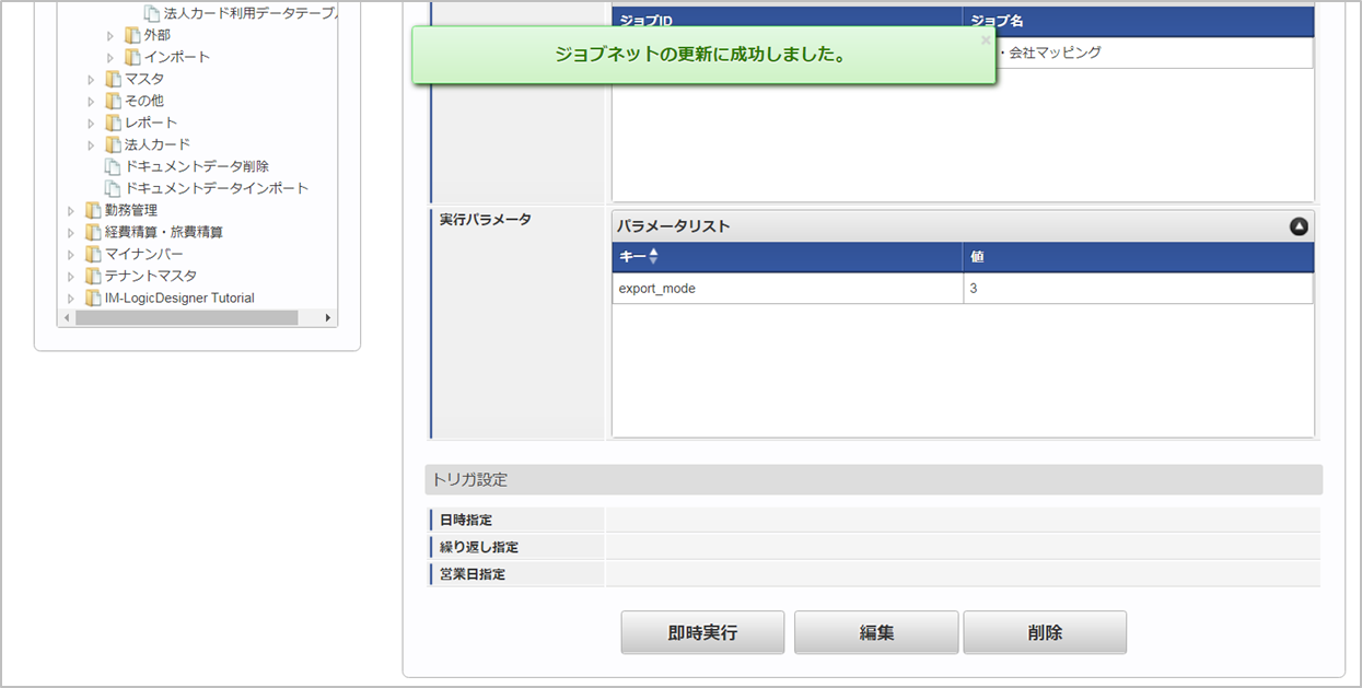 「サイトマップ」→「テナント管理」→「ジョブネット設定」をクリックします。 ジョブネット一覧(画面左部)の「契約・会社マッピング」をクリックします。 「編集」をクリックします。 必要に応じて「実行パラメータ」、「トリガ設定」を編集します。コラム
