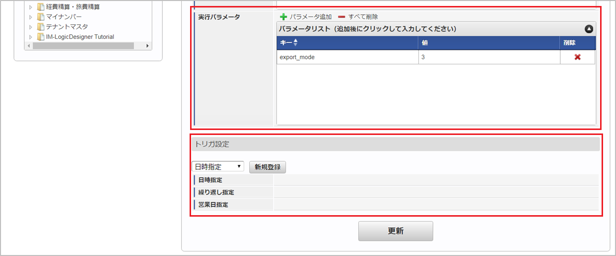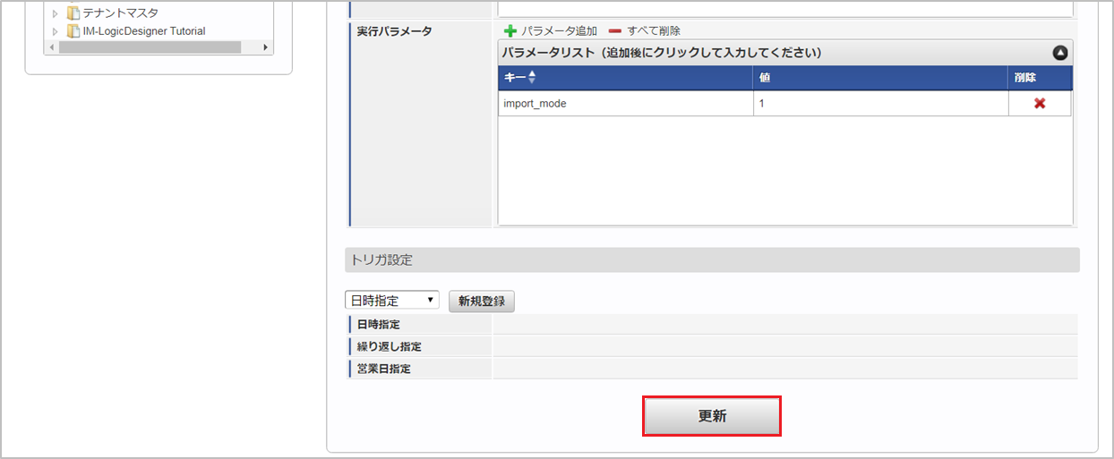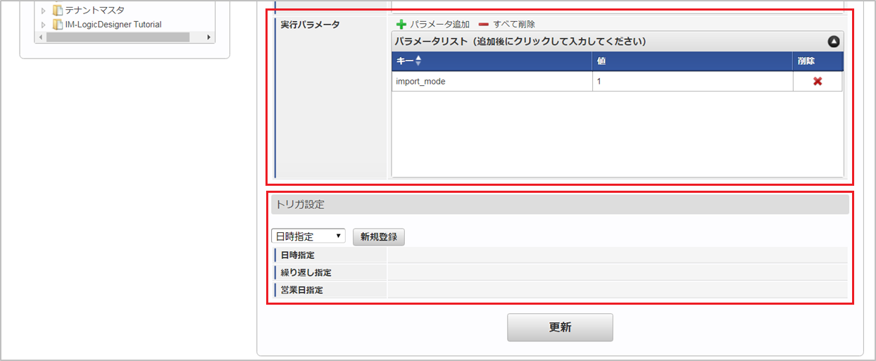設定が必要な実行パラメータの詳細は、実行パラメータを参照してください。トリガ設定の設定方法は『テナント管理者操作ガイド』を参照してください。コラム