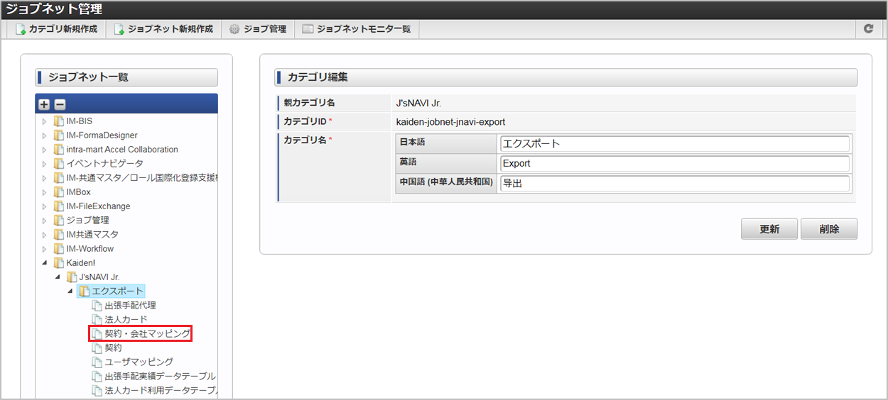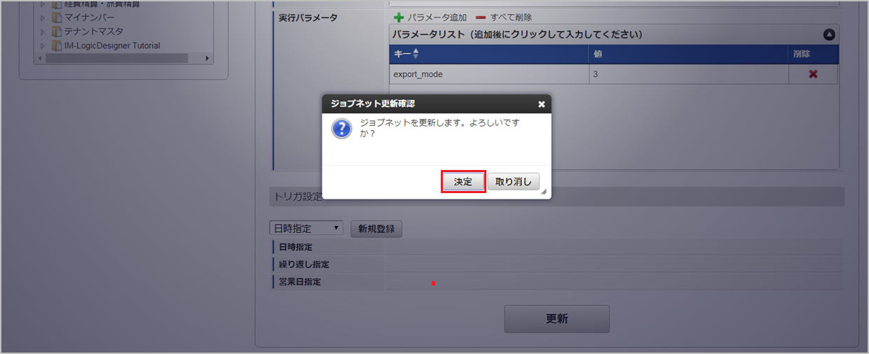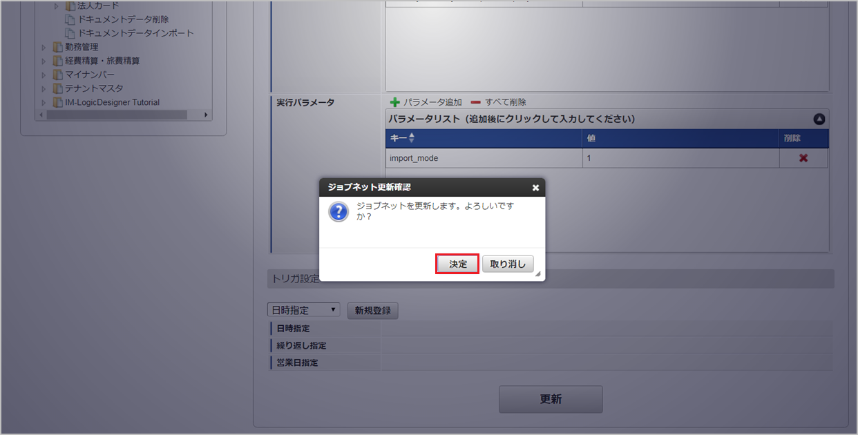 ジョブID ジョブ名(ジョブ選択時のツリー) kaiden-job-base-jnavi-export-company Kaiden! / J’sNAVI Jr. / エクスポート / 契約・会社マッピング 編集後、「更新」をクリックします。 確認ポップアップの「決定」をクリックします。 ジョブネットが設定されました。