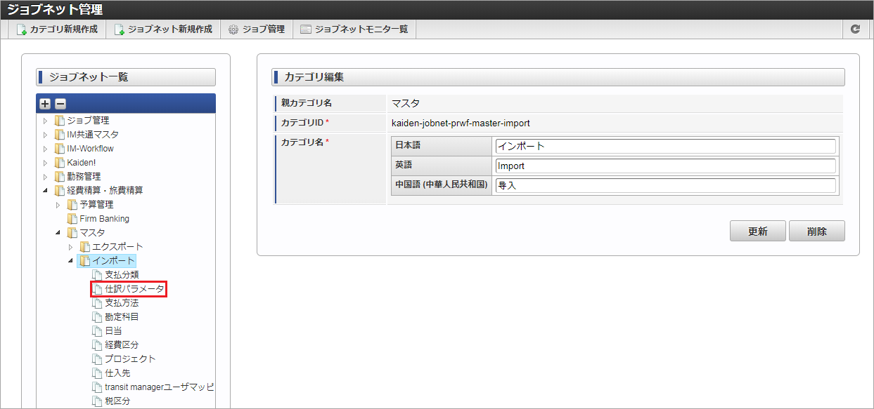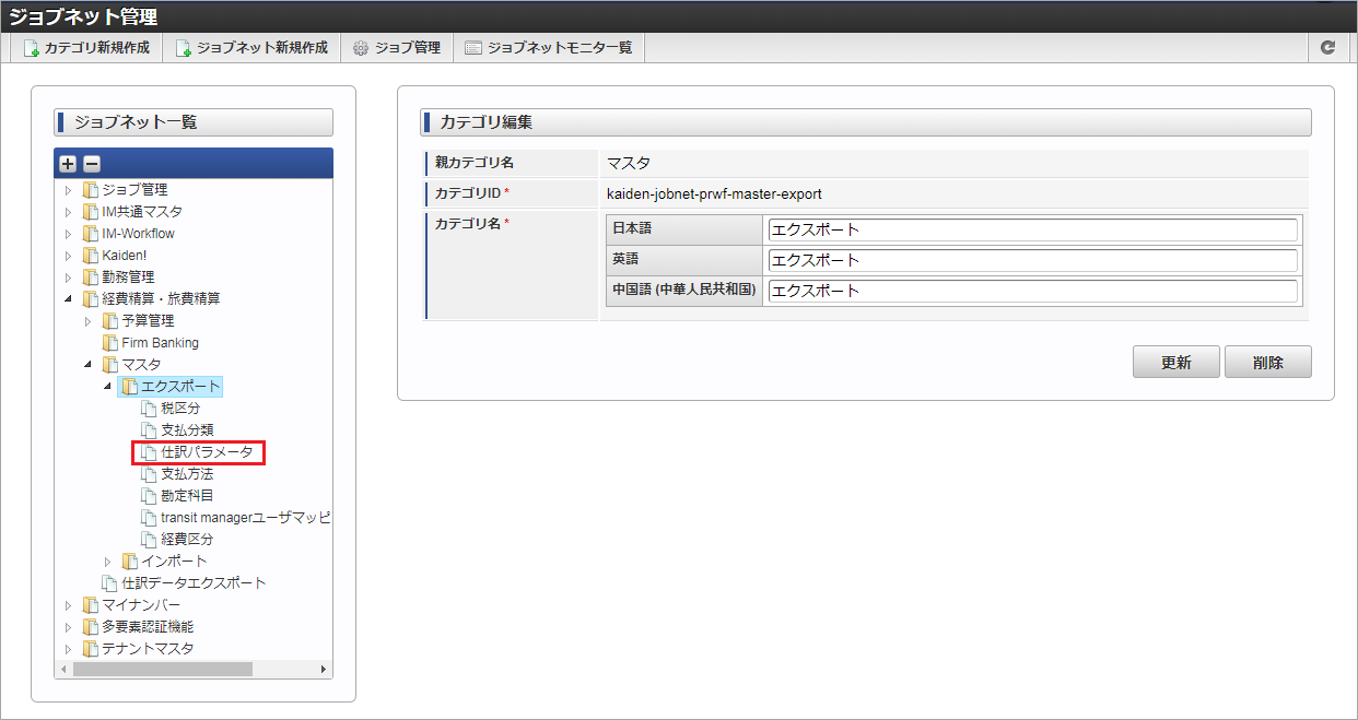 ジョブID ジョブ名(ジョブ選択時のツリー) kaiden-job-master-export-journalprm 経費旅費・旅費精算 / マスタ / エクスポート / 仕訳パラメータ 編集後、「更新」をクリックします。 確認ポップアップの「決定」をクリックします。 ジョブネットが設定されました。