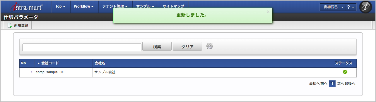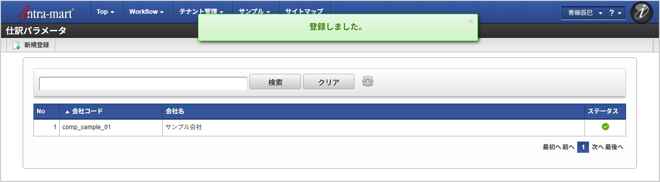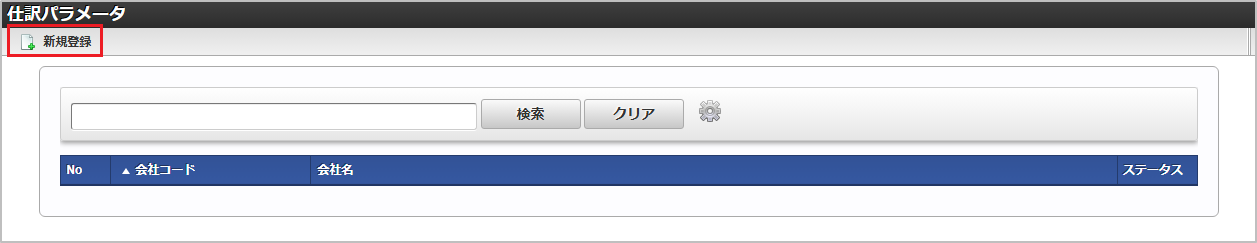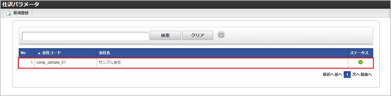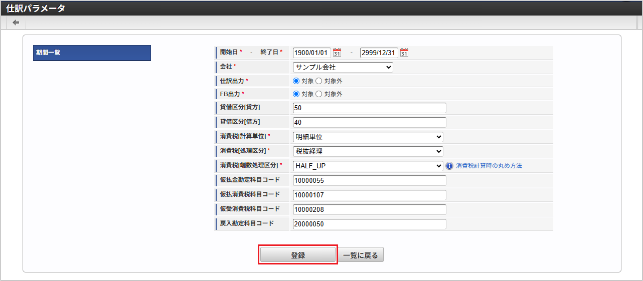「サイトマップ」→「経費精算・旅費精算」→「マスタメンテナンス」→「仕訳パラメータ」をクリックします。 一覧画面表示後、「新規登録」をクリックします。 登録/更新画面で必要な情報を入力し、「登録」をクリックします。