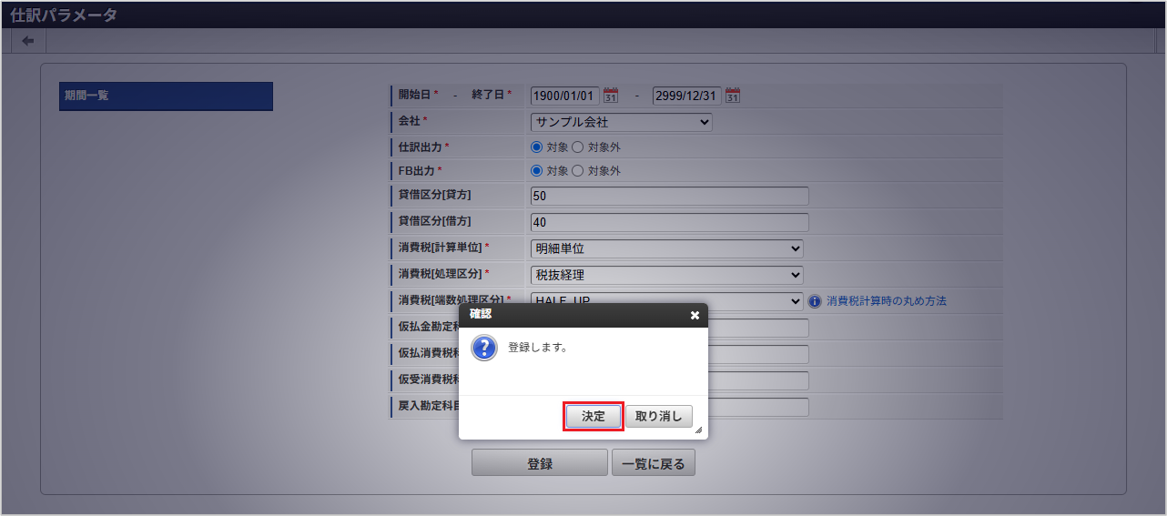仕訳出力「対象」を指定すると、仕訳出力が有効に設定されます。 FB出力「対象」を指定すると、FBデータ出力が有効に設定されます。 貸借区分[貸方]貸方レコードであることを識別するための値を指定します。※ 経理システムなど出力した仕訳データの連携先で必要な値にしてください。 貸借区分[借方]借方レコードであることを識別するための値を指定します。※ 経理システムなど出力した仕訳データの連携先で必要な値にしてください。 消費税[計算単位]税抜経理の場合に消費税を計算する単位です。「明細単位」のみ指定可能です。 消費税[処理区分]「税抜経理」を選択すると、経費支出などの費用にかかる仮払消費税を別レコードに分割して出力します。 消費税[端数処理区分]税抜経理の場合に使用する、消費税計算時の丸め方法です。 仮払金勘定科目コード事前申請書にて入力された仮払金に関する仕訳で使用する勘定科目コードです。 仮払消費税科目コード税抜経理の場合に仮払消費税に関する仕訳で使用する勘定科目コードです。 仮受消費税科目コード税抜経理の場合に仮受消費税に関する仕訳で使用する勘定科目コードです。 戻入勘定科目コード精算申請書で戻入が発生した場合の仕訳で使用する勘定科目コードです。未指定の場合は、事前申請書で選択した 支払方法の「債務勘定科目コード」の設定値が利用されます。 確認ポップアップが表示されますので、「決定」をクリックします。 新規登録することができました。