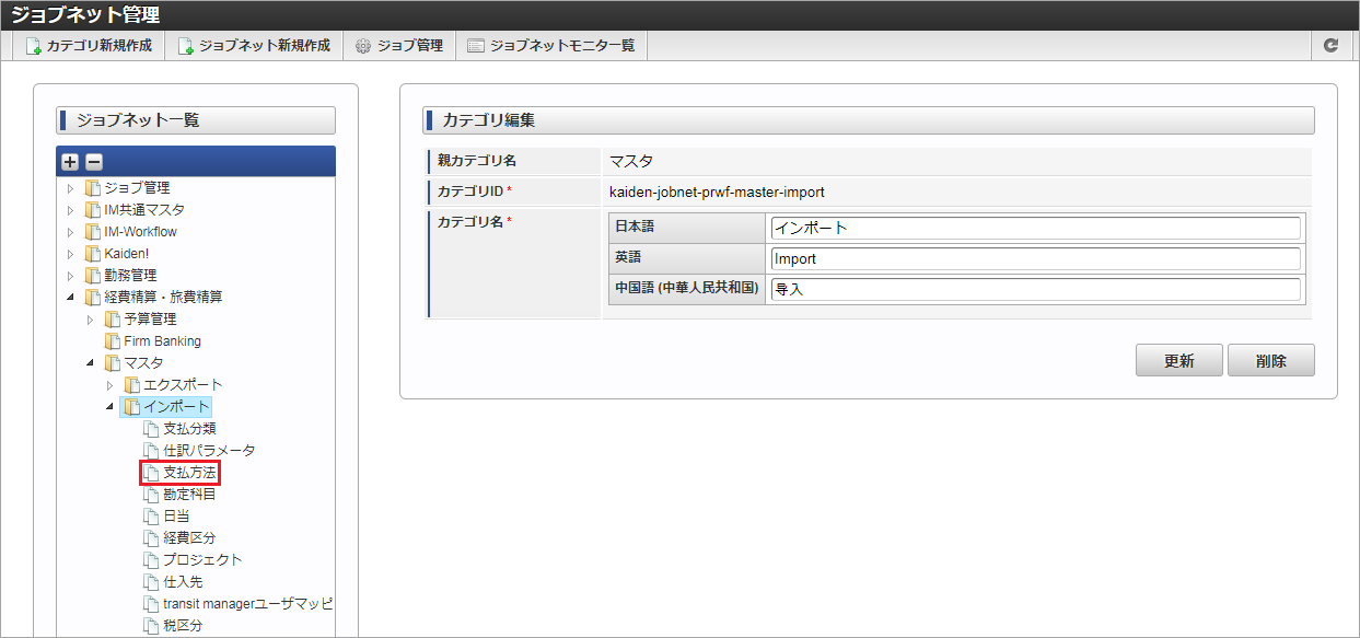 ジョブID ジョブ名(ジョブ選択時のツリー) kaiden-job-master-import-paymethod 経費旅費・旅費精算 / マスタ / インポート / 支払方法 編集後、「更新」をクリックします。 確認ポップアップの「決定」をクリックします。 ジョブネットが設定されました。コラム