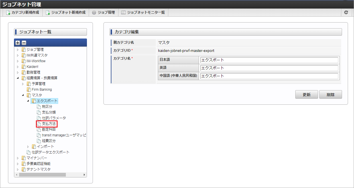 ジョブID ジョブ名(ジョブ選択時のツリー) kaiden-job-master-export-paymethod 経費旅費・旅費精算 / マスタ / エクスポート / 支払方法 編集後、「更新」をクリックします。 確認ポップアップの「決定」をクリックします。 ジョブネットが設定されました。