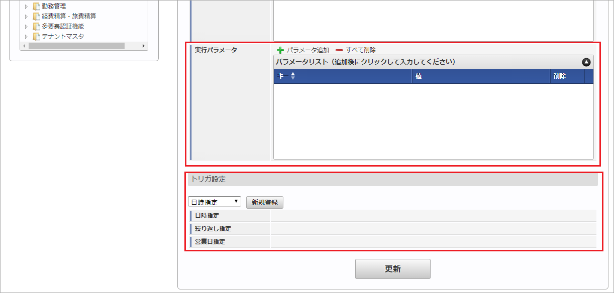 設定が必要な実行パラメータの詳細は、実行パラメータを参照してください。トリガ設定の設定方法は『テナント管理者操作ガイド』を参照してください。コラム