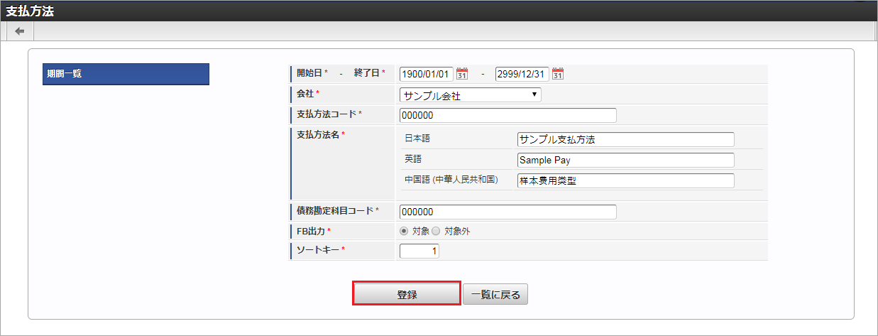 項目 項目名 備考 companyCd 会社コード payMethodCd 支払方法コード startDate 開始日 yyyy/MM/dd形式 endDate 終了日 yyyy/MM/dd形式 localeId ロケール ja:日本語en:英語zh_CN:中国語payMethodName 支払方法名 accountCdPayable 債務勘定科目コード fbOutputFlag FB出力フラグ 0:対象外1:対象sortKey ソートキー deleteFlag 削除フラグ 0:有効1:無効