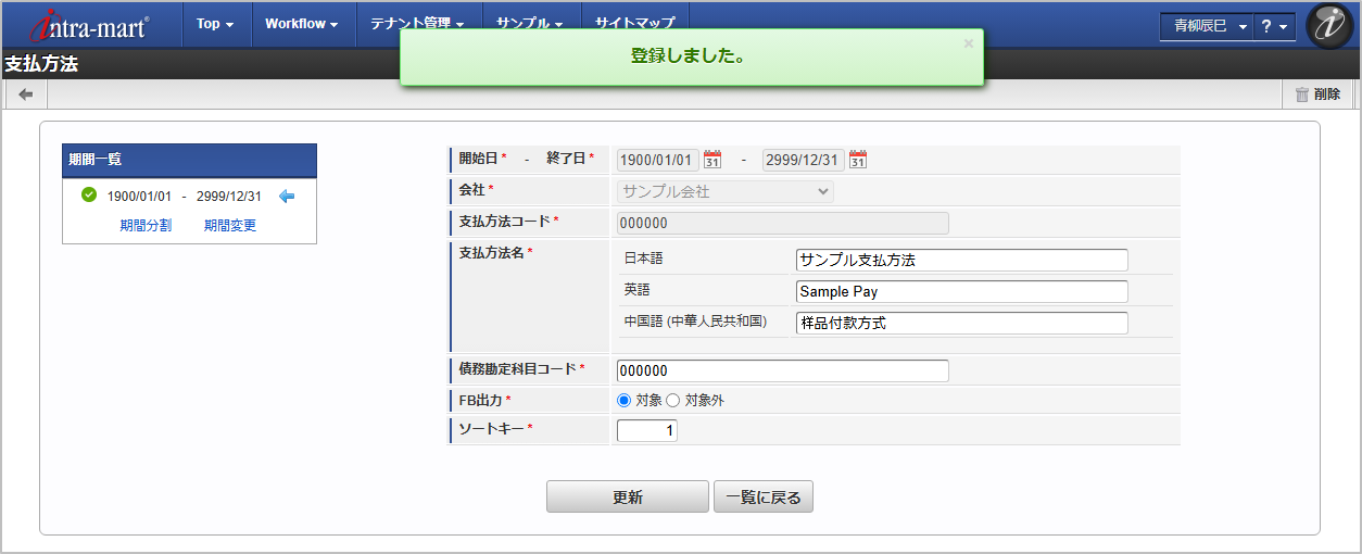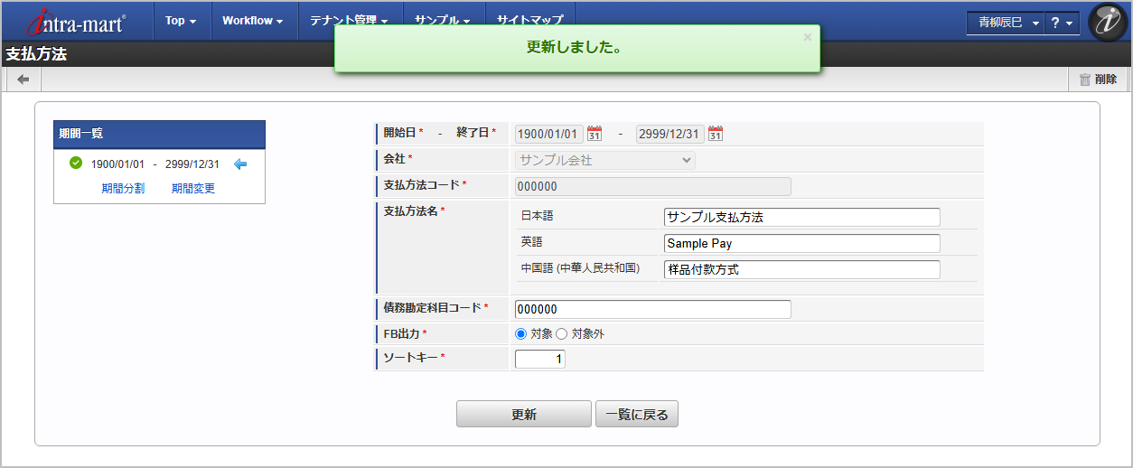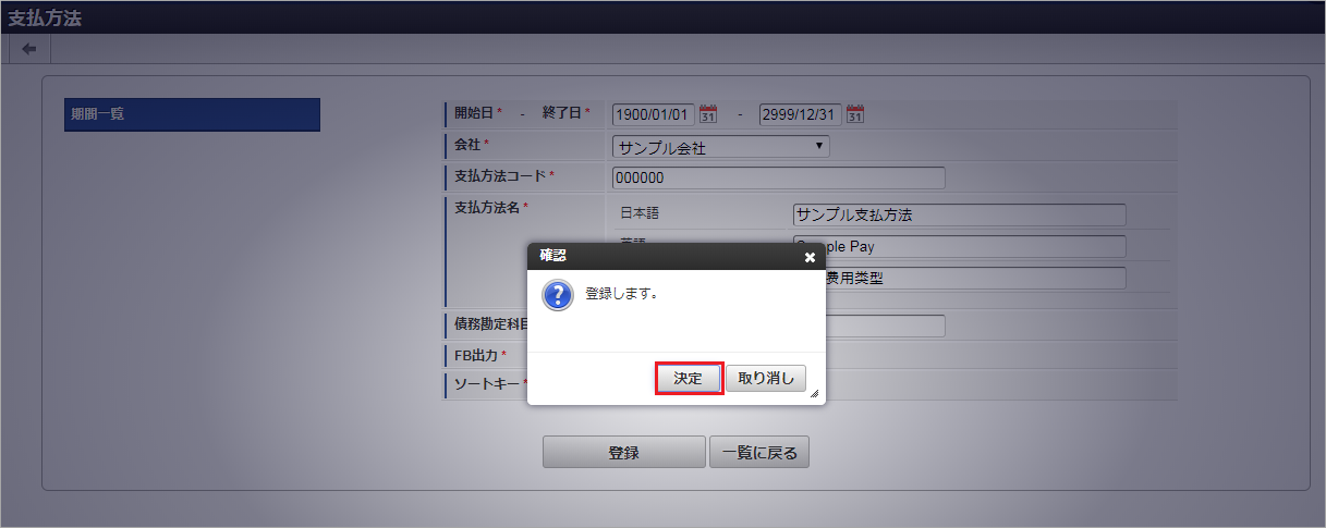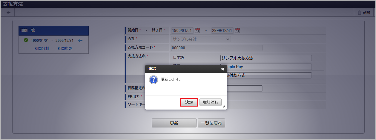 期間機能の操作方法は、 期間の操作 を参照してください。 確認ポップアップが表示されますので、「決定」をクリックします。 更新することができました。