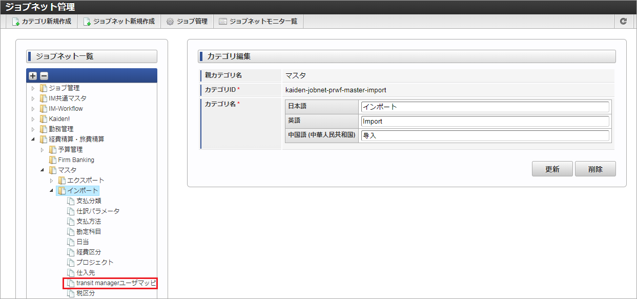 ジョブID ジョブ名(ジョブ選択時のツリー) kaiden-job-master-import-tmusermapping 経費旅費・旅費精算 / マスタ / インポート / transit managerユーザマッピング 編集後、「更新」をクリックします。 確認ポップアップの「決定」をクリックします。 ジョブネットが設定されました。コラム