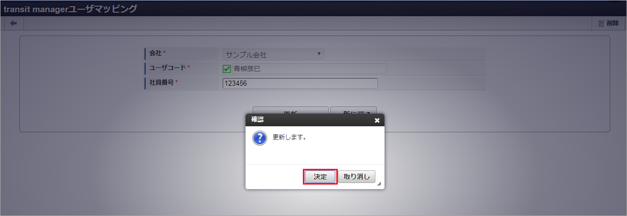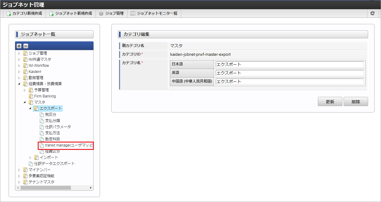 ジョブID ジョブ名(ジョブ選択時のツリー) kaiden-job-master-export-tmusermapping 経費旅費・旅費精算 / マスタ / エクスポート / transit managerユーザマッピング 編集後、「更新」をクリックします。 確認ポップアップの「決定」をクリックします。 ジョブネットが設定されました。