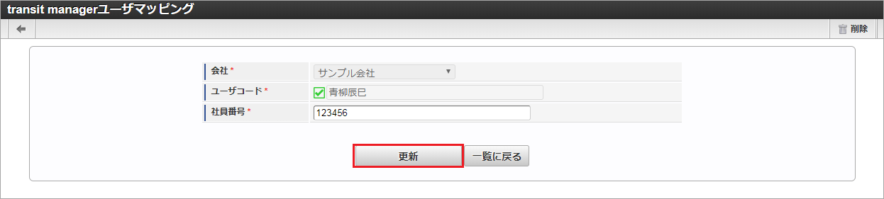 「サイトマップ」→「経費精算・旅費精算」→「マスタメンテナンス」→「transit managerユーザマッピングマスタ」をクリックします。 一覧画面で「検索」をクリックします。コラム