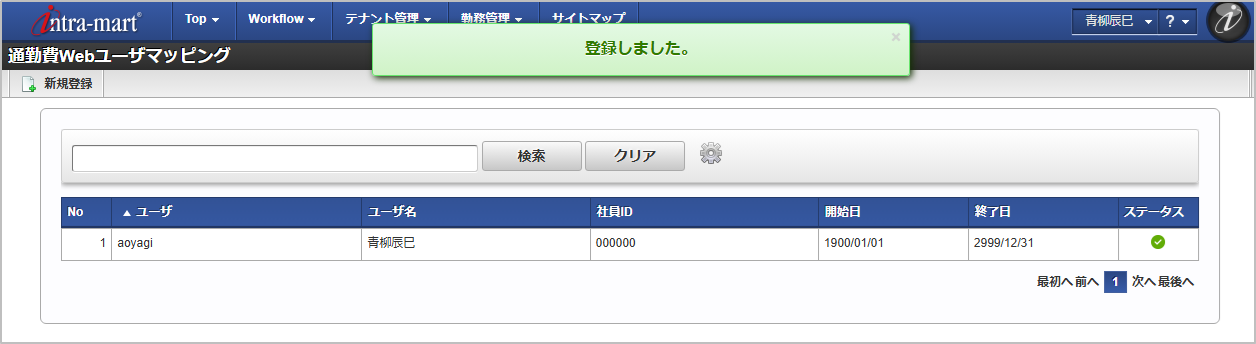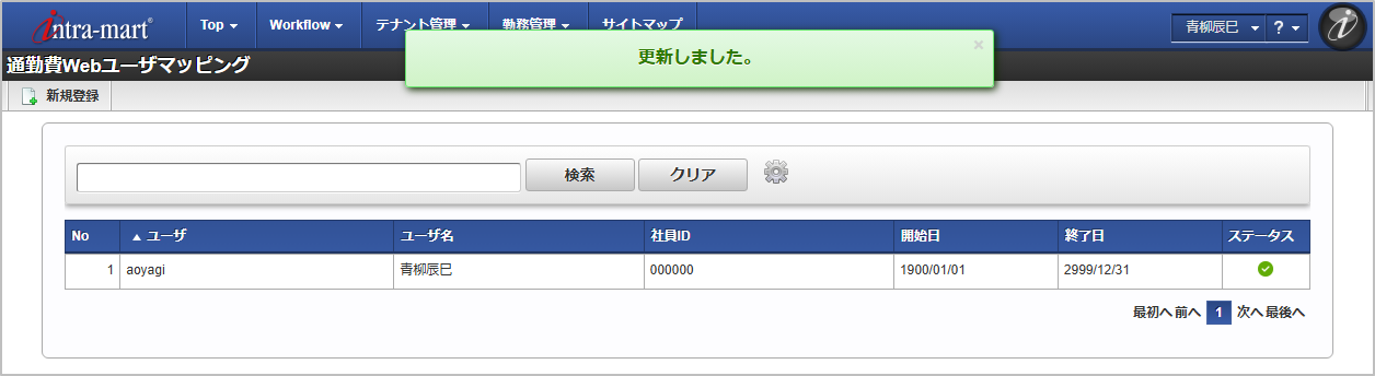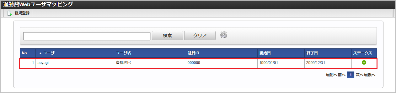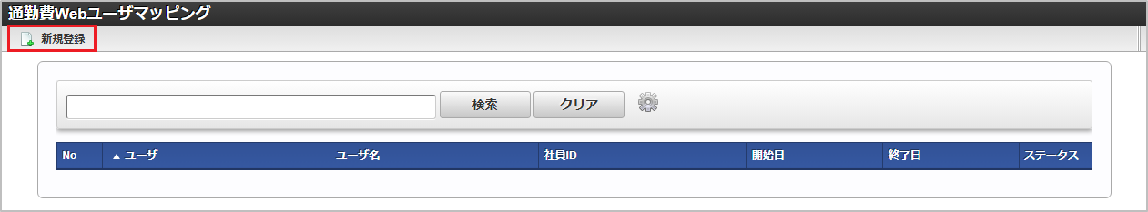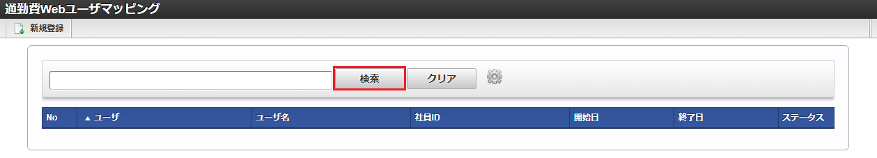 検索欄に検索したい通勤費Webユーザマッピングマスタの以下の項目を入力して「検索」をクリックすると、結果を一覧に表示します。