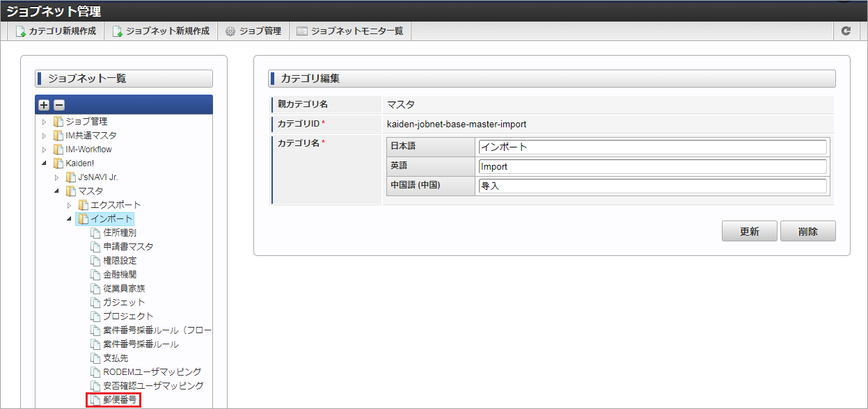 ジョブID ジョブ名(ジョブ選択時のツリー) kaiden-job-master-import-zipcode Kaiden! / マスタ / インポート / 郵便番号 編集後、「更新」をクリックします。 確認ポップアップの「決定」をクリックします。 ジョブネットが設定されました。
