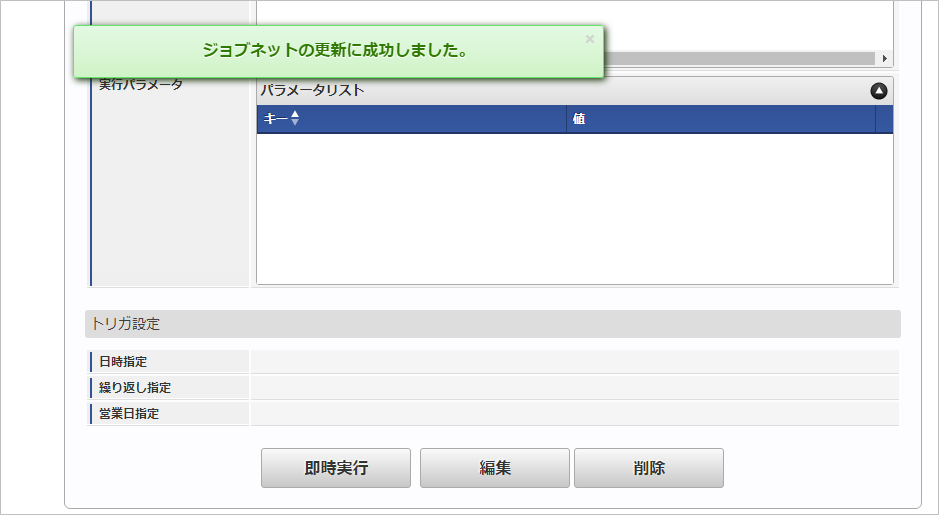「サイトマップ」→「テナント管理」→「ジョブネット設定」をクリックします。 ジョブネット一覧(画面左部)の「郵便番号」をクリックします。 「編集」をクリックします。 必要に応じて「実行パラメータ」、「トリガ設定」を編集します。コラム