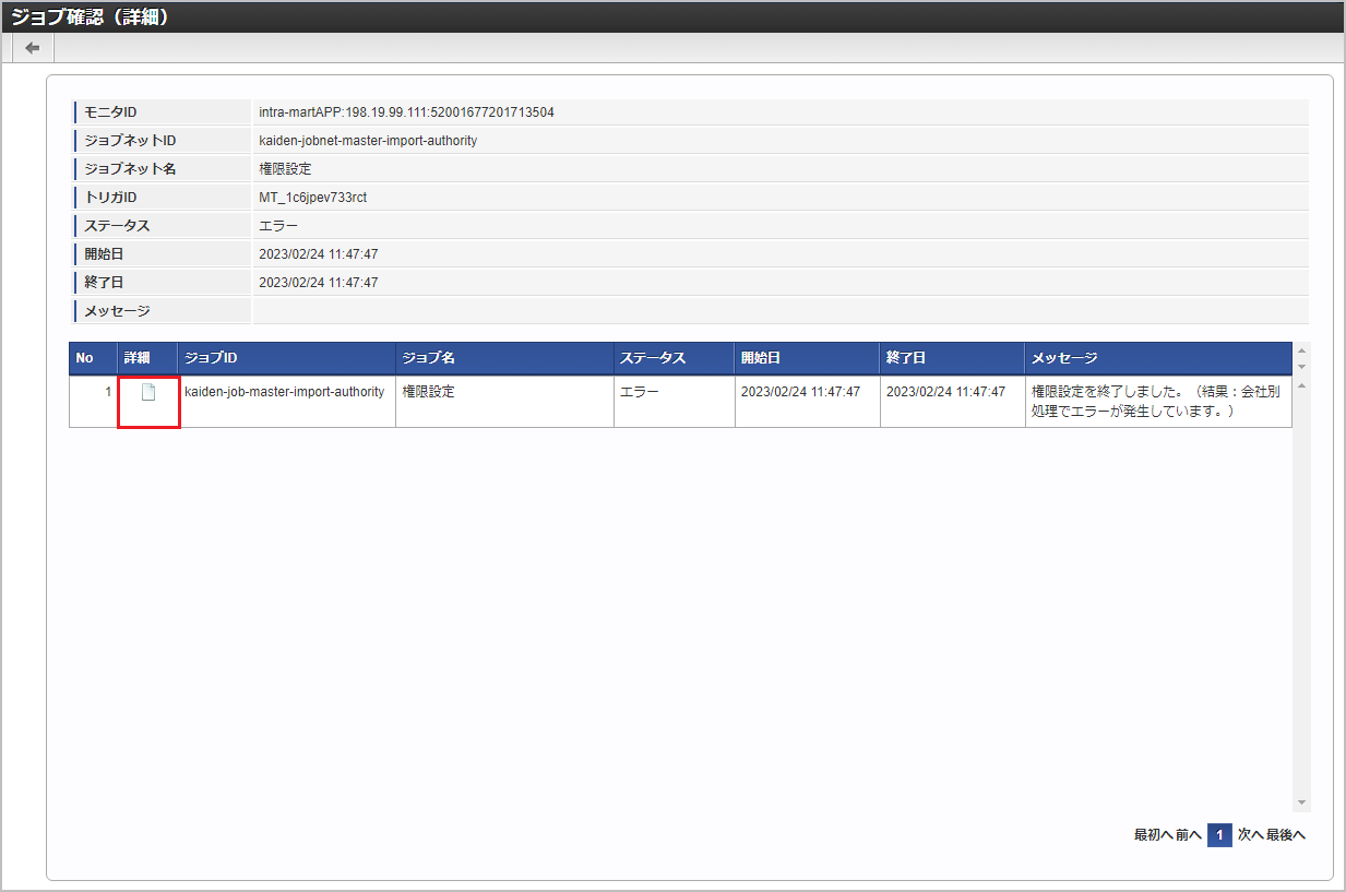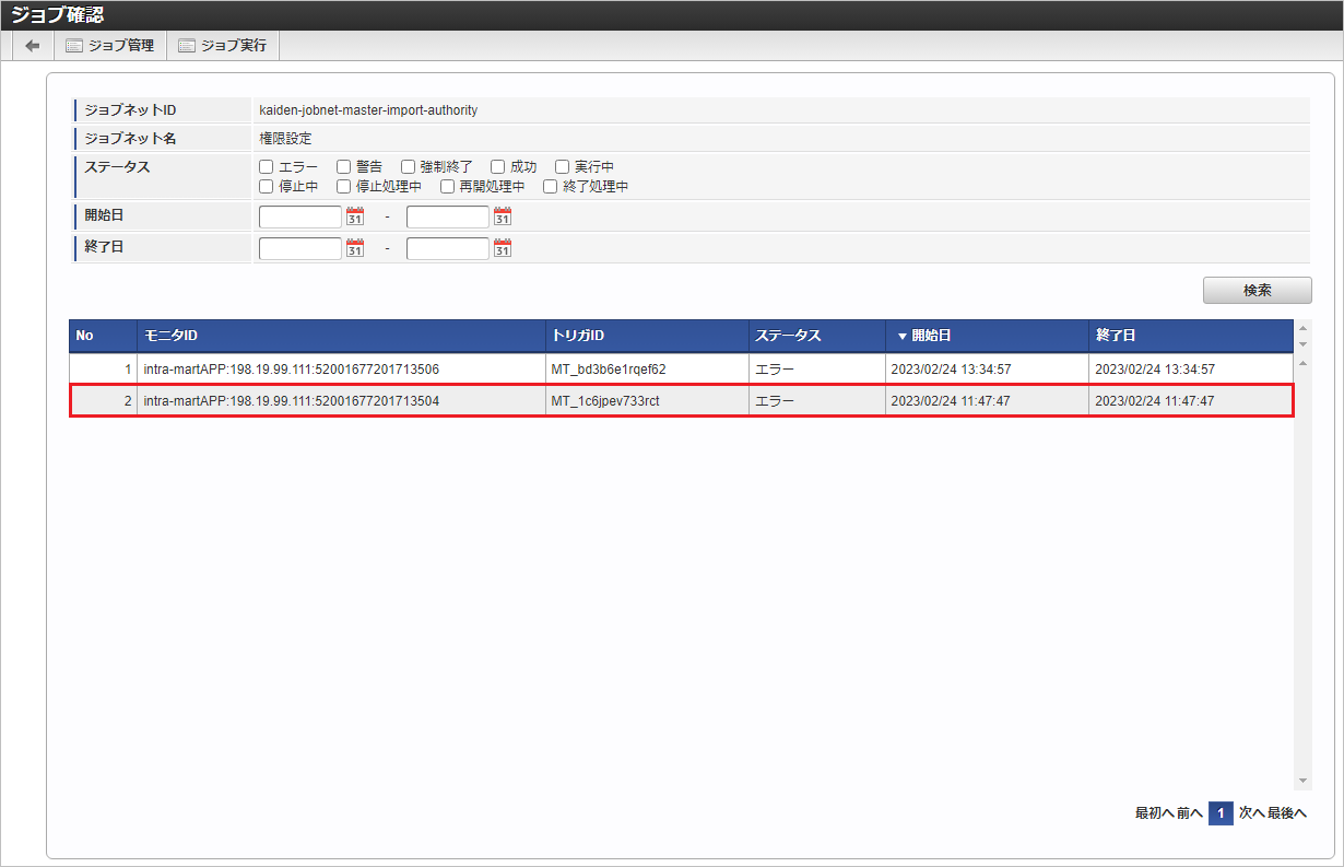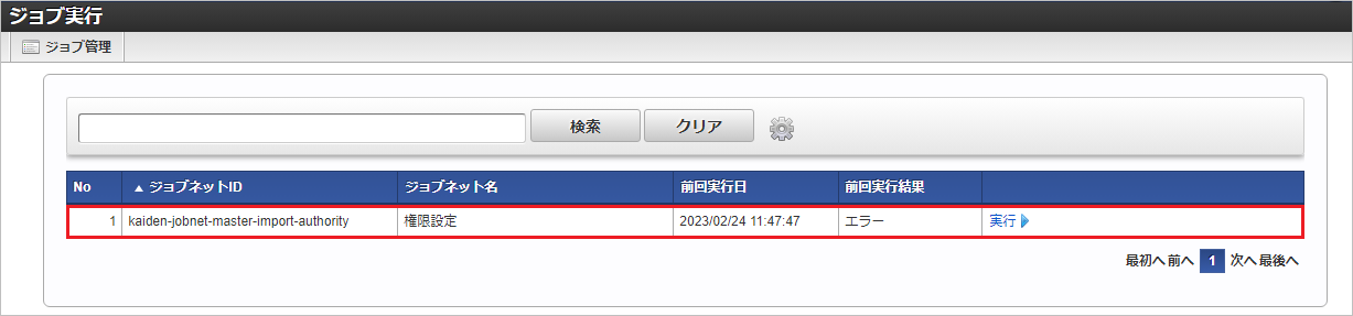 - ジョブネット実行結果の詳細を確認したい行をクリックします。