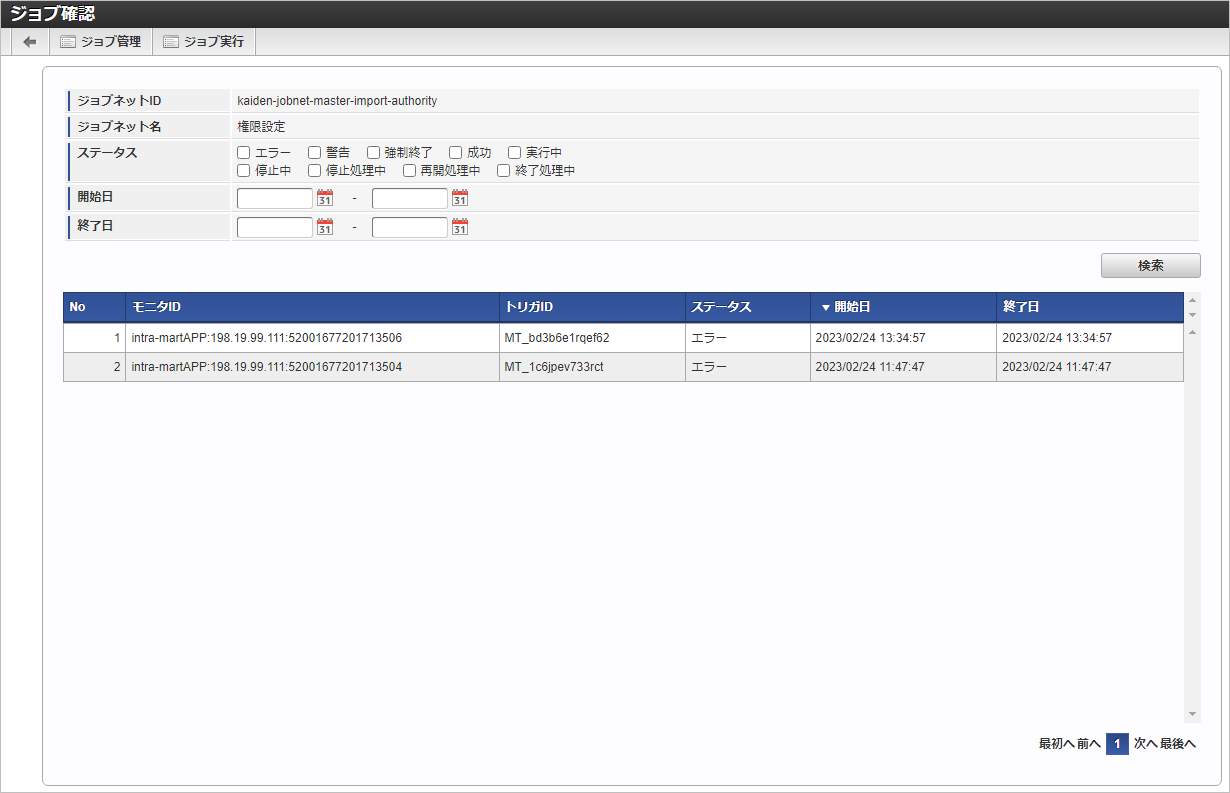 ジョブネットモニタなど、ジョブ実行以外の機能から実行した実行結果を含めて表示されます。 検索条件を入力して「検索」をクリックすると、検索条件で絞り込んだ実行結果が一覧表示されます。