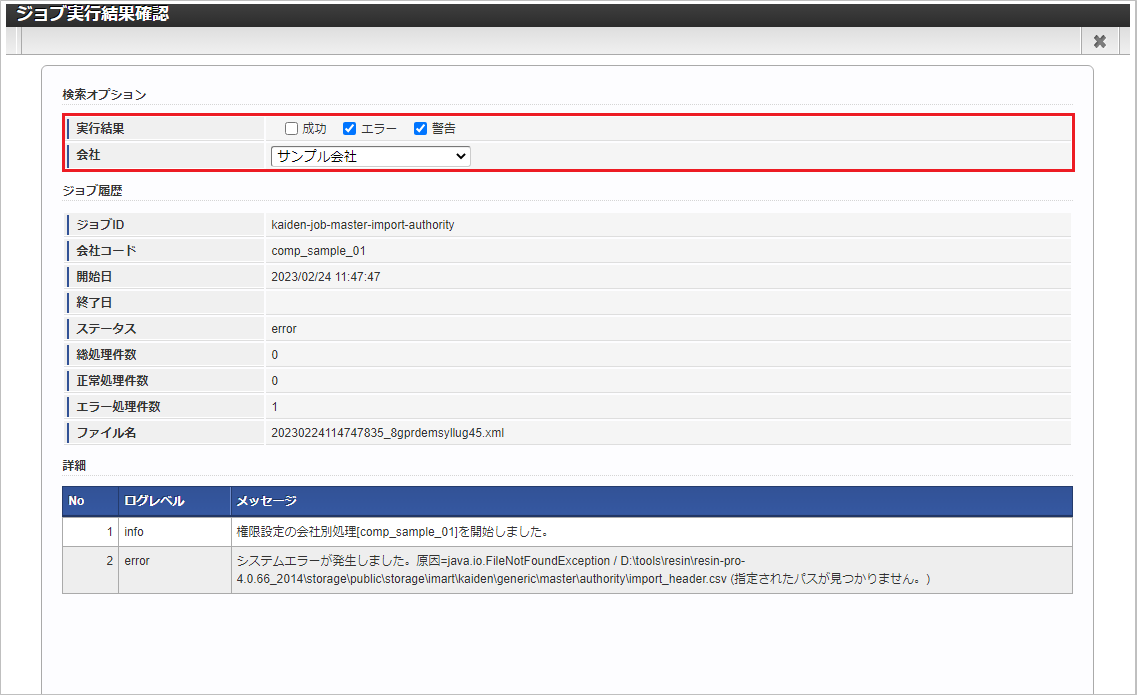 - 「検索オプション」を変更すると、設定した検索オプションで絞り込んだジョブ履歴が表示されます。