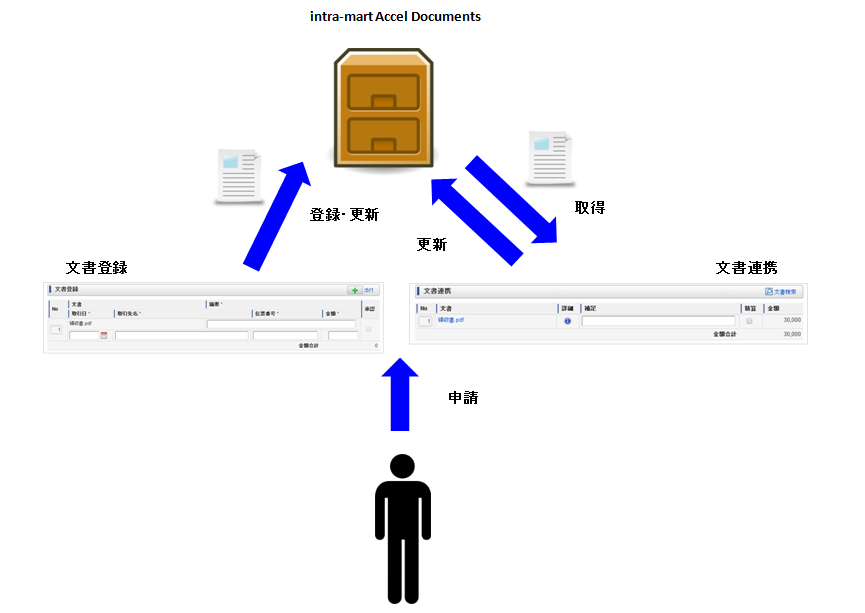 本項では、 intra-mart Accel Documents と連携して電子化した文書を申請に使用する際の概要を説明します。文書登録ガジェットを使用すると、 intra-mart Accel Documents に文書を登録できます。文書連携ガジェットを使用すると、 intra-mart Accel Documents の文書を選択して申請書を作成できます。コラム