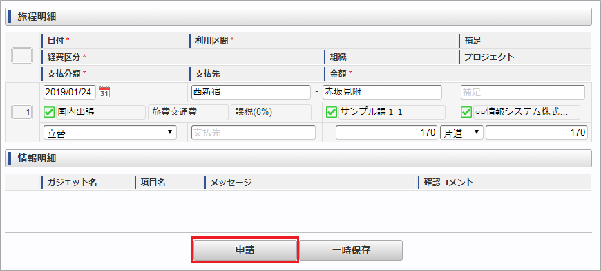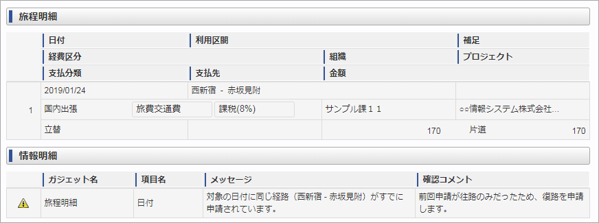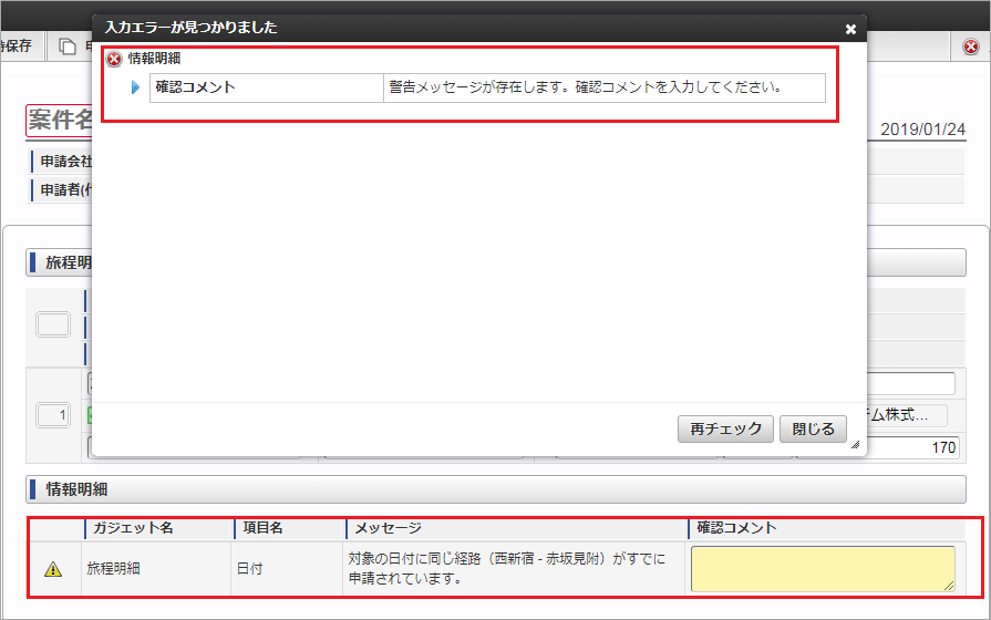 本項では、確認コメントが任意入力のアラート(warning)を設定した際の操作を説明します。 アラートを設定している申請書を開きます。 入力後、「申請」をクリックします。 バリデーションのチェックが実施され、チェックNGの場合情報明細ガジェットにメッセージが表示されます。 また、「確認コメント」の入力が必須です。 処理時もアラートのメッセージを確認できます。
