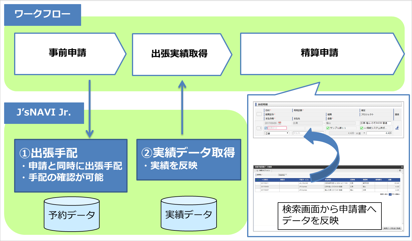 本項では、「J’sNAVI Jr.」の出張手配サービスと連携するイメージを紹介します。