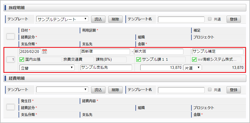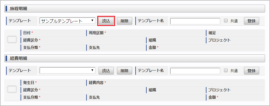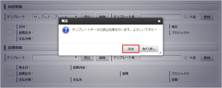 本項では、ガジェットのテンプレートを読込する際の操作を説明します。 ガジェットのテンプレート機能を設定した申請書を開きます。 テンプレートを選択し、「読込」をクリックします。 確認ポップアップが表示されますので、「決定」をクリックします。 テンプレートを読込することができました。
