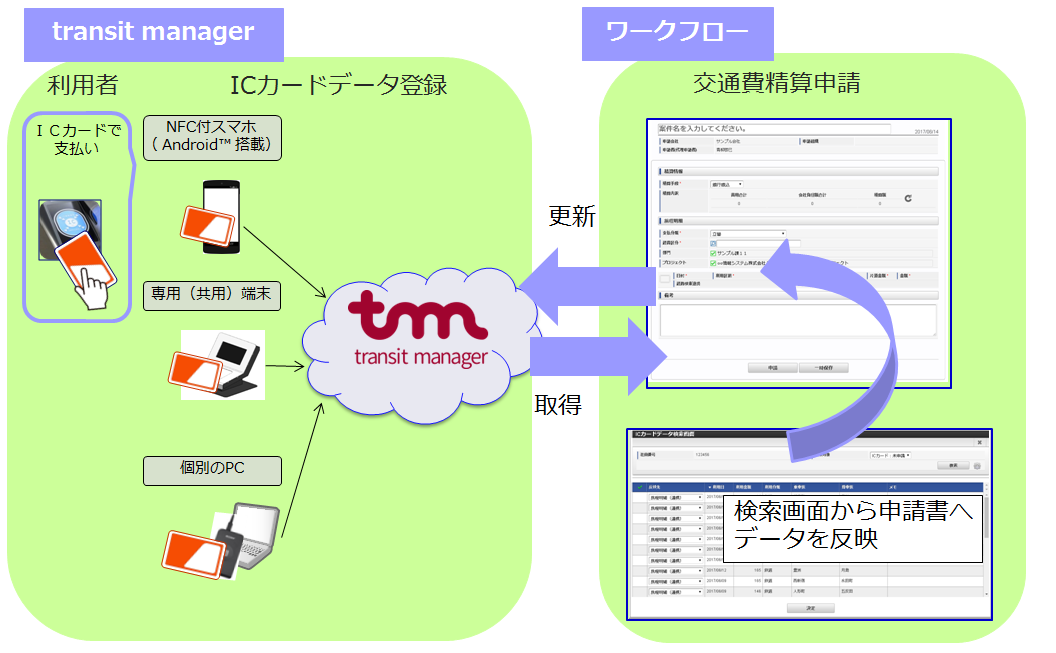 本項では、「transit manager」から交通系ICカードデータを取得し Kaiden! の精算に使用するイメージを紹介します。