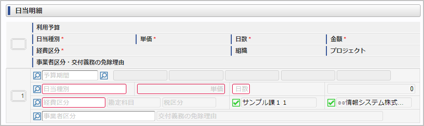 項目名 説明 予算期間 予算期間を選択します。 利用予算 利用する予算を表示します。 日当種別 旅費規程などに基づき該当する日当を選択します。 単価 選択した日当種別に紐づく単価を表示します。 日数 日当の該当する日数を入力します。 金額 単位 × 日数の計算結果を表示します。 経費区分 経費区分(勘定科目と税区分の組み合わせ)を選択します。 (勘定科目) 選択した経費区分に紐づく勘定科目を表示します。 (税区分) 選択した経費区分に紐づく税区分を表示します。 組織 費用の計上組織を選択します。 プロジェクト 費用の計上プロジェクトを選択します。 事業者区分・交付義務の免除理由 申請書に事業者区分・交付義務の免除理由が含まれている場合に利用できます。インボイス制度の事業者区分、適格請求書交付義務の免除理由を選択します。コラム