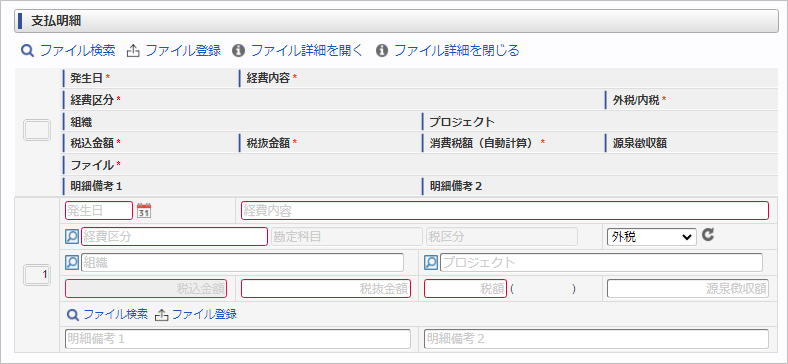 項目名 説明 発生日 経費の発生日を入力します。 経費内容 経費の概要を入力します。 経費区分 経費区分(勘定科目と税区分の組み合わせ)を選択します。 (勘定科目) 選択した経費区分に紐づく勘定科目を表示します。 (税区分) 選択した経費区分に紐づく税区分を表示します。 外税/内税 経費が内税か外税かを選択します。選択内容により、入力項目が変化します。(再計算) 金額を再計算します。 組織 費用の計上組織を選択します。 プロジェクト 費用の計上プロジェクトを選択します。 税込金額 税込金額を入力します。外税/内税項目で外税を選択した場合は、税抜金額 + 消費税額を表示します。税抜金額 税抜金額を入力します。外税/内税項目で内税を選択した場合は、税込金額 - 消費税額を表示します。消費税額 消費税額を入力します。 (消費税額(自動計算)) 税込金額、または税抜金額と税区分に紐づく税率を計算した金額を表示します。 源泉徴収額 源泉徴収額を入力します。請求書払情報で選択した仕入先により、入力可否が変化します。ファイル 申請書にファイル検索が含まれている場合に利用できます。 明細備考1 明細備考を入力します。 明細備考2 明細備考を入力します。 コラム