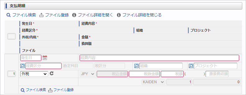 項目名 説明 発生日 経費の発生日を入力します。 経費内容 経費の概要を入力します。 経費区分 経費区分(勘定科目と税区分の組み合わせ)を選択します。 (勘定科目) 選択した経費区分に紐づく勘定科目を表示します。 (税区分) 選択した経費区分に紐づく税区分を表示します。 組織 費用の計上組織を選択します。 プロジェクト 費用の計上プロジェクトを選択します。 外税/内税 経費が内税か外税かを選択します。選択内容により、入力項目が変化します。(再計算) 金額を再計算します。 (通貨) 請求書払情報(外貨支払)で選択した通貨が選択されています。 税込金額 税込金額を入力します。外税/内税項目で外税を選択した場合は、税抜金額 + 消費税額を表示します。税抜金額 税抜金額を入力します。外税/内税項目で内税を選択した場合は、税込金額 - 消費税額を表示します。消費税額 消費税額を入力します。 (消費税額(自動計算)) 税込金額、または税抜金額と税区分に紐づく税率を計算した金額を表示します。 源泉徴収額 源泉徴収額を入力します。請求書払情報(外貨支払)で選択した仕入先により、入力可否が変化します。ファイル 申請書にファイル検索が含まれている場合に利用できます。 コラム